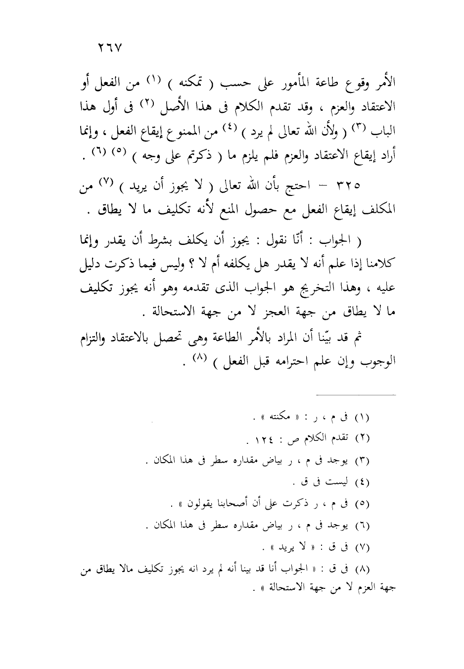 ٣٢٥ - احتج بأن الله تعالى (لا يجوز أن يريد) من المكلف إيقاع الفعل مع حصول المنع لأنه تكليف ما لا يطاق.