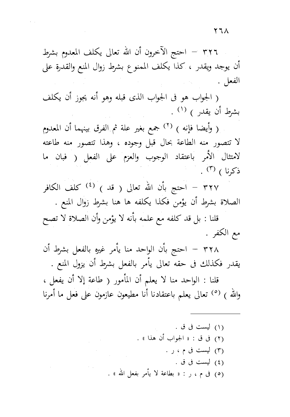 ٣٢٦ - احتج الآخرون أن الله تعالى يكلف المعدوم بشرط أن يوجد ويقدر، كذا يكلف الممنوع بشرط زوال المنع والقدرة على الفعل.