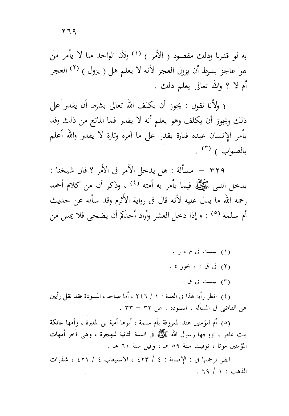 ٣٢٩ - مسألة: هل يدخل الآمر في الأمر؟ قال شيخنا: يدخل النبي صلى الله عليه وسلم فيما يأمر به أمته، وذكر أن من كلام أحمد رحمه الله ما يدل عليه لأنه قال في رواية الأثرم وقد سأله عن حديث أم سلمة: "إذا دخل العشر وأراد أحدكم أن يضحي فلا يمس من