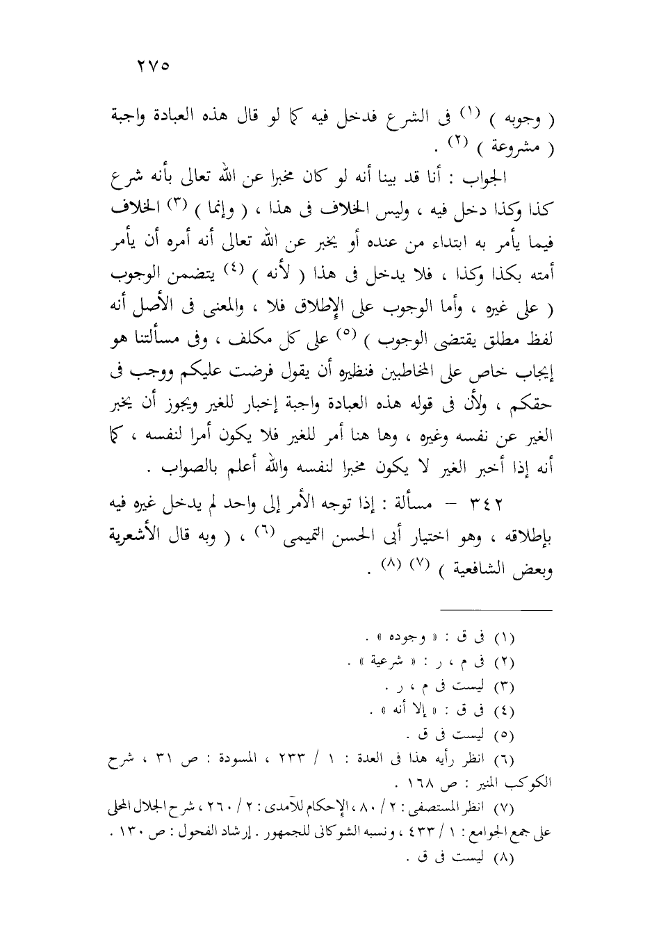 الجواب: أنا قد بينا أنه لو كان مخبراً عن الله تعالى بأنه شرع كذا وكذا دخل فيه، وليس الخلاف في هذا، (وإنما) الخلاف فيما يأمر به ابتداء من عنده أو يخبر عن الله تعالى أنه أمره أن يأمر أمته بكذا وكذا، فلا يدخل في هذا (لأنه) يتضمن الوجوب (على غيره، وأما الوجوب على الإطلاق فلا، والمعنى في الأصل أنه لفظ مطلق يقتضي الوجوب) على كل مكلف، وفي مسألتنا هو إيجاب خاص على المخاطبين فنظيره أن يقول فرضت عليكم ووجب في حقكم، ولأن في قوله هذه العبادة واجبة إخبار للغير ويجوز أن يخبر الغير عن نفسه وغيره، وها هنا أمر للغير فلا يكون أمراً لنفسه، كما أنه إذا أخبر الغير لا يكون مخبراً لنفسه والله أعلم بالصواب.