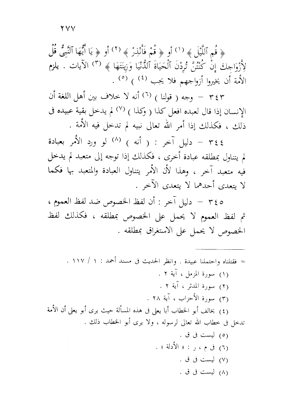 ٣٤٣ - وجه (قولنا) أنه لا خلاف بين أهل اللغة أن الإنسان إذا قال لعبده افعل كذا (وكذا) لم يدخل بقية عبيده في ذلك، فكذلك إذا أمر الله تعالى نبيه لم تدخل فيه الأمة.