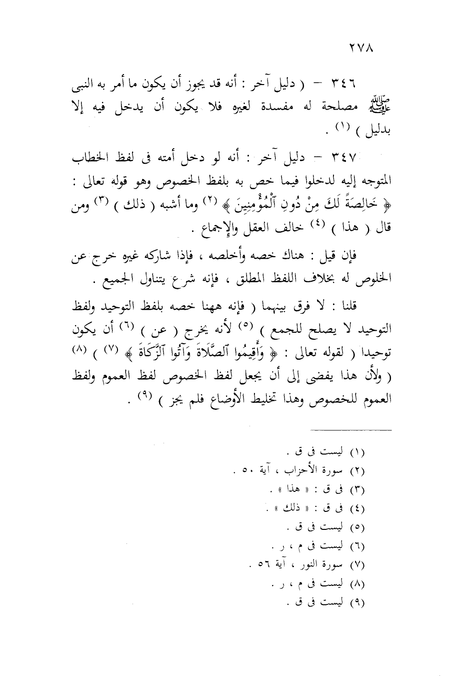 ٣٤٧ - دليل آخر: أنه لو دخل أمته في لفظ الخطاب المتوجه إليه لدخلوا فيما خص به بلفظ الخصوص وهو قوله تعالى: {خَالِصَةً لَكَ مِنْ دُونِ الْمُؤْمِنِينَ} وما أشبه (ذلك) ومن قال (هذا) خالف العقل والإجماع.