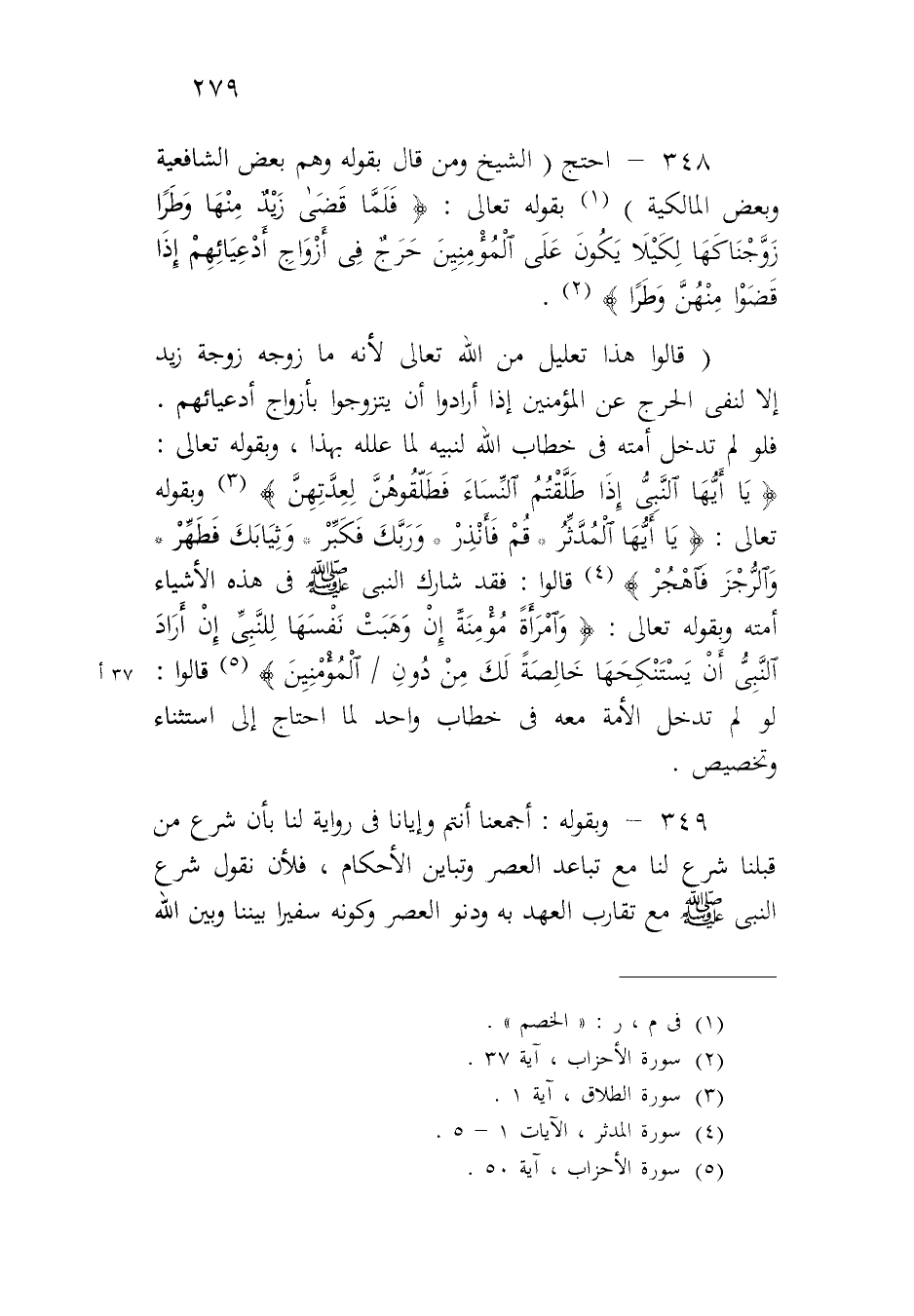 ٣٤٨ - احتج (الشيخ ومن قال بقوله وهم بعض الشافعية وبعض المالكية) بقوله تعالى: {فَلَمَّا قَضَى زَيْدٌ مِنْهَا وَطَراً زَوَّجْنَاكَهَا لِكَيْ لا يَكُونَ عَلَى الْمُؤْمِنِينَ حَرَجٌ فِي أَزْوَاجِ أَدْعِيَائِهِمْ إِذَا قَضَوْا مِنْهُنَّ وَطَراً}.