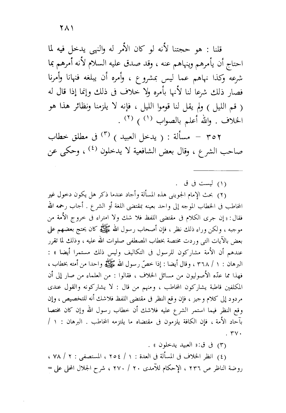 ٣٥٢ - مسألة: (يدخل العبيد) في مطلق خطاب صاحب الشرع، وقال بعض الشافعية لا يدخلون، وحكي عن
