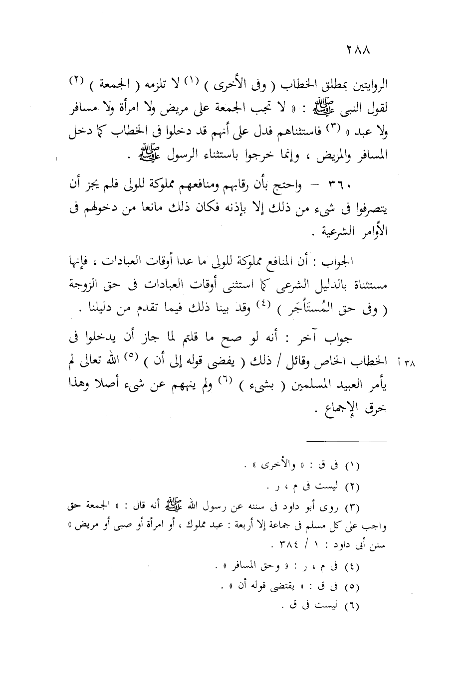 ٣٦٠ - واحتج بأن رقابهم ومنافعهم مملوكة للولي فلم يجز أن يتصرفوا في شيء من ذلك إلا بإذنه فكان ذلك مانعاً من دخولهم في الأوامر الشرعية.