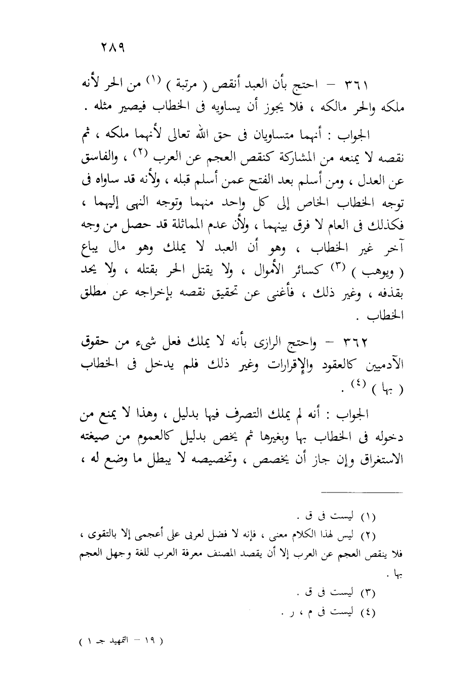 ٣٦١ - احتج بأن العبد أنقص (مرتبة) من الحر لأنه ملكه والحر مالكه، فلا يجوز أن يساويه في الخطاب فيصير مثله.