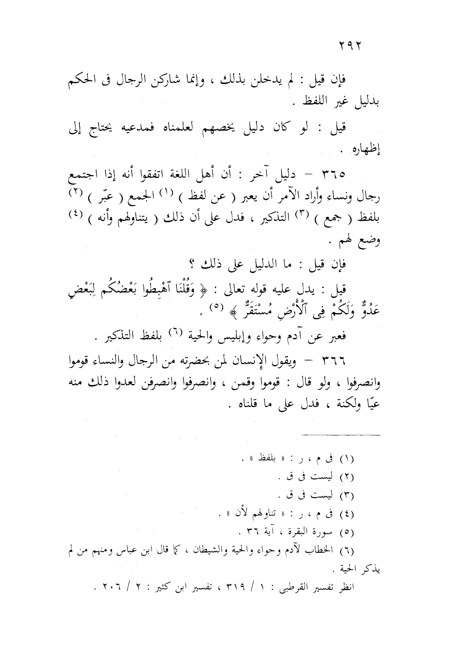٣٦٥ - دليل آخر: أن أهل اللغة اتفقوا أنه إذا اجتمع رجال ونساء وأراد الآمر أن يعبر (عن لفظ) الجمع (عبر) بلفظ (جمع) التذكير، فدل على أن ذلك (يتناولهم وأنه) وضع لهم.