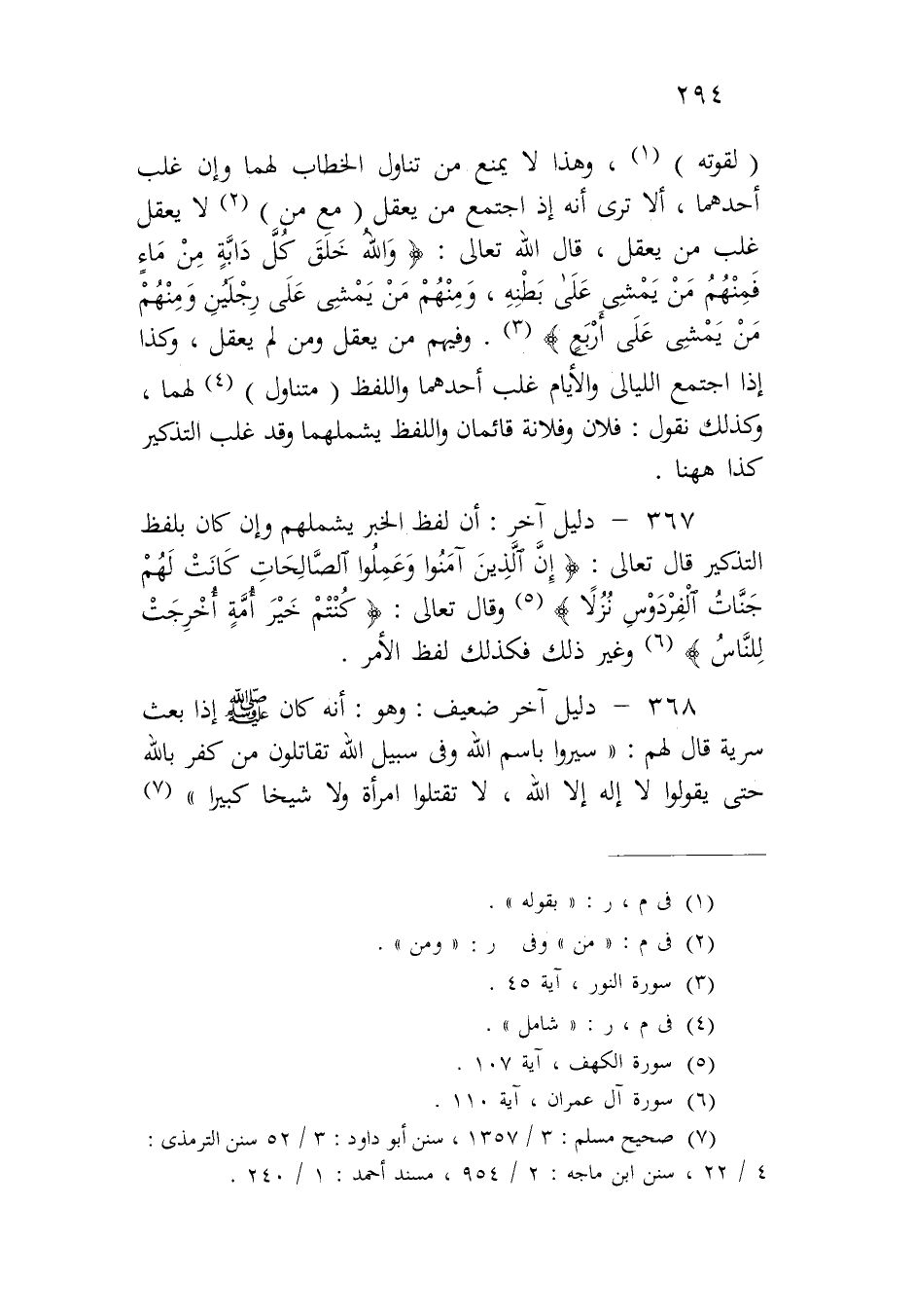 (لقوته)، وهذا لا يمنع من تناول الخطاب لهما وإن غلب أحدهما، ألا ترى أنه إذا اجتمع من يعقل (مع من) لا يعقل غلب من يعقل، قال الله تعالى: {وَاللَّهُ خَلَقَ كُلَّ دَابَّةٍ مِنْ مَاءٍ فَمِنْهُمْ مَنْ يَمْشِي عَلَى بَطْنِهِ وَمِنْهُمْ مَنْ يَمْشِي عَلَى رِجْلَيْنِ وَمِنْهُمْ مَنْ يَمْشِي عَلَى أَرْبَعٍ}. وفيهم من يعقل ومن لم يعقل، وكذا إذا اجتمع الليالي والأيام غلب أحدهما واللفظ (متناول) لهما، وكذلك نقول: فلان وفلانة قائمان واللفظ يشملهما وقد غلب التذكير كذا ههنا.