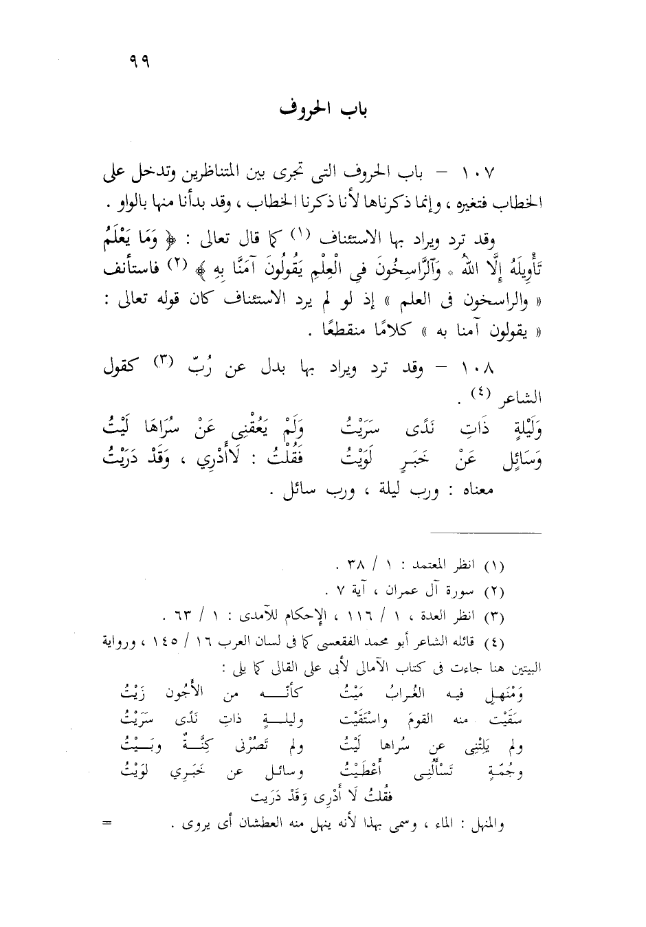 ١٠٧ - باب الحروف التي تجرى بين المتناظرين وتدخل على الخطاب فتغيره، وإنما ذكرناها لأنا ذكرنا الخطاب، وقد بدأنا منها بالواو.