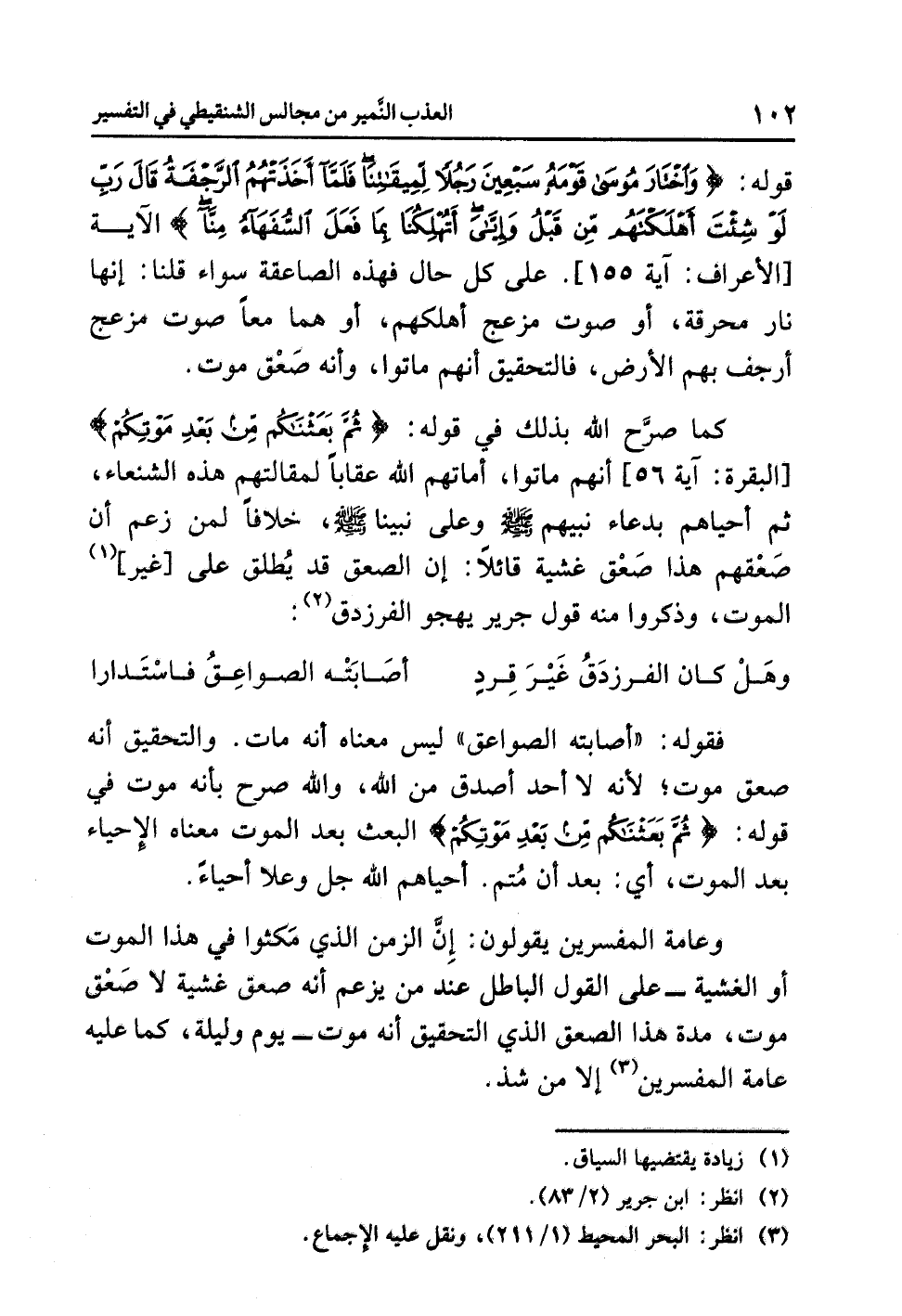 قوله: {وَاخْتَارَ مُوسَى قَوْمَهُ سَبْعِينَ رَجُلاً لِّمِيقَاتِنَا فَلَمَّا أَخَذَتْهُمُ الرَّجْفَةُ قَالَ رَبِّ لَوْ شِئْتَ أَهْلَكْتَهُم مِّن قَبْلُ وَإِيَّايَ أَتُهْلِكُنَا بِمَا فَعَلَ السُّفَهَاءُ مِنَّا} [الأعراف: آية 155]. على كُلِّ حالٍ فهذه الصاعقةُ سواء قلنا: إنها نارٌ مُحْرِقَةٌ، أو صوتٌ مزعجٌ أَهْلَكَهُمْ، أو هما معًا صوتٌ مزعجٌ أَرْجَفَ بهم الأرضَ، فالتحقيقُ أنهم مَاتُوا، وأنه صَعْقُ موتٍ، كما صرَّحَ اللَّهُ بذلكَ في قولِه: {ثُمَّ بَعَثْنَاكُم مِّنْ بَعْدِ مَوْتِكُمْ} [البقرة: آية 56] أنهم ماتوا، أَمَاتَهُمُ اللَّهُ عقابًا لمقالتِهم هذه الشنعاءِ، ثم أحياهم بدعاءِ نَبِيِّهِمْ - صلى الله عليه وسلم - وعلى نبينا، خلافًا لِمَنْ زعم أن صَعْقَهُمْ هذا صَعْقُ غشيةٍ قائلاً: إن الصعقَ قد يُطْلَقُ على [غيرِ] (¬1) الموتِ، وذكروا منه قولَ جريرٍ يهجو الفرزدقَ (¬2):