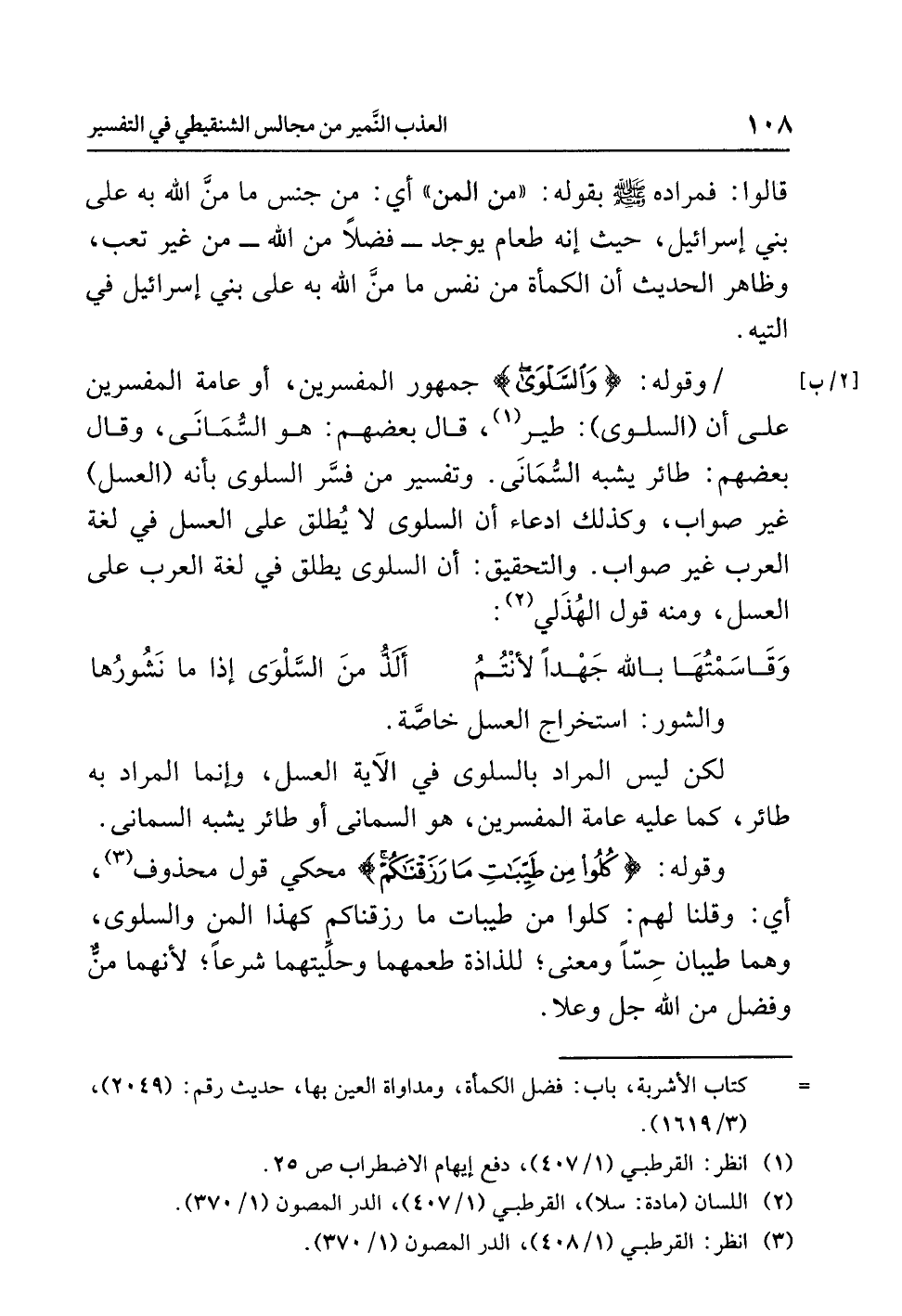 [2/ب] / وقوله: {وَالسَّلْوَى} جمهورُ المفسرين، أو عامةُ المفسرين على أن (السلوى): طَيْرٌ (¬1)، قال بعضُهم: هو السُّمَانَى، وقال بعضُهم: طائرٌ يُشْبِهُ السُّمَانَى. وتفسيرُ مَنْ فَسَّرَ السلوى بأنه (العسلُ) غيرُ صوابٍ، وكذلك ادعاءُ أن السلوى لا يُطْلَقُ على العسلِ في لغةِ العربِ غيرُ صوابٍ. والتحقيقُ: أن السلوى يُطْلَقُ في لغةِ العربِ على العسلِ، ومنه قولُ الْهُذَلِيِّ (¬2):