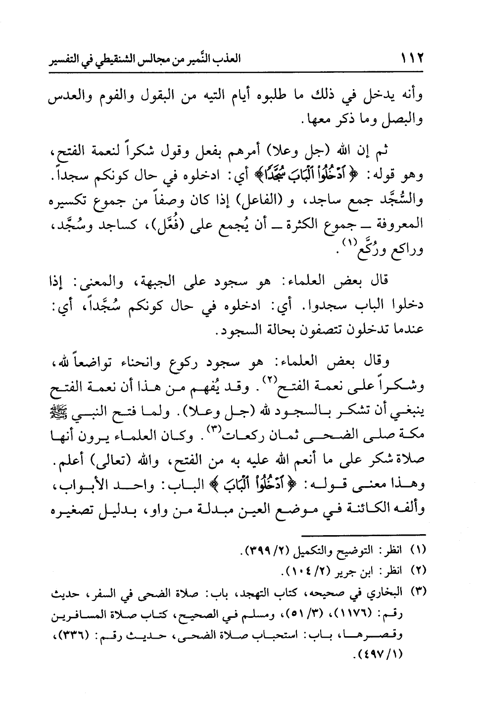 وقال بعضُ العلماءِ: هو سجودُ ركوعٍ وانحناءٍ تَوَاضُعًا لِلَّهِ وشكرًا على نعمةِ الفتحِ (¬2). وقد يُفْهَمُ من هذا أن نعمةَ الفتحِ ينبغي أن تشكرَ بالسجودِ لِلَّهِ (جل وعلا). وَلَمَّا فتحَ النبيُّ - صلى الله عليه وسلم - مكةَ صلى الضحى ثمان ركعاتٍ (¬3). وكان العلماءُ يَرَوْنَ أنها صلاةُ شكرٍ على ما أَنْعَمَ اللَّهُ عليه به من الفتحِ، واللَّهُ (تعالى) أعلمُ. وهذا معنى قولِه: {ادْخُلُوا الْبَابَ} البابُ: واحدُ الأبوابِ، وَأَلِفُهُ الكائنةُ في موضعِ العينِ مبدلةٌ من واوٍ، بدليلِ تصغيرِه