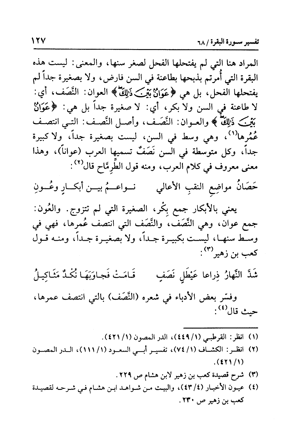 المرادَ هنا التي لم يَفْتَحِلْهَا الفحلُ لِصِغَرِ سِنِّهَا، والمعنى: ليست هذه البقرةُ التي أُمِرْتُمْ بِذَبْحِهَا بطاعنةٍ في السِّنِّ فارضٍ، ولا بصغيرةٍ جِدًّا لم يَفْتَحِلْهَا الفحلُ، بل هي {عَوَانٌ بَيْنَ ذَلِكَ} العوانُ: النَّصَفُ، أي: لا طاعنةٌ في السِّنِّ ولا بكرٌ، أي: لا صغيرةٌ جِدًّا بل هي: {عَوَانٌ بَيْنَ ذَلِكَ} والعوانُ: النَّصَفُ، وأصلُ النَّصفِ: التي انْتَصَفَ عُمُرها (¬1)، وهي وسطٌ في السِّنِّ، ليست بصغيرةٍ جِدًّا، ولا كبيرةٍ جِدًّا، وَكُلُّ متوسطةٍ في السنِّ نَصَفٌ تُسَمِّيهَا العربُ (عَوَانًا)، وهذا معنًى معروفٌ في كلامِ العربِ، ومنه قولُ الطِّرِمَّاحِ قال (¬2):