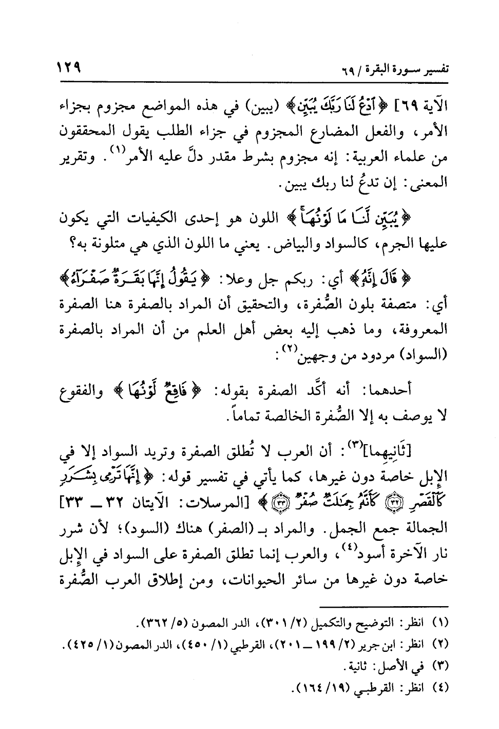الآية 69] {ادْعُ لَنَا رَبَّكَ يُبَيِّنْ} (يبين) في هذه المواضعِ مجزومٌ بجزاءِ الأَمْرِ، والفعلُ المضارعُ المجزومُ في جزاءِ الطلبِ يقولُ الْمُحَقِّقُونَ من علماءِ العربيةِ: إنه مجزومٌ بشرطٍ مُقَدَّرٍ دَلَّ عليه الأَمْرُ (¬1). وتقريرُ المعنى: إِنْ تَدْعُ لَنَا رَبَّكَ يُبَيِّنْ.