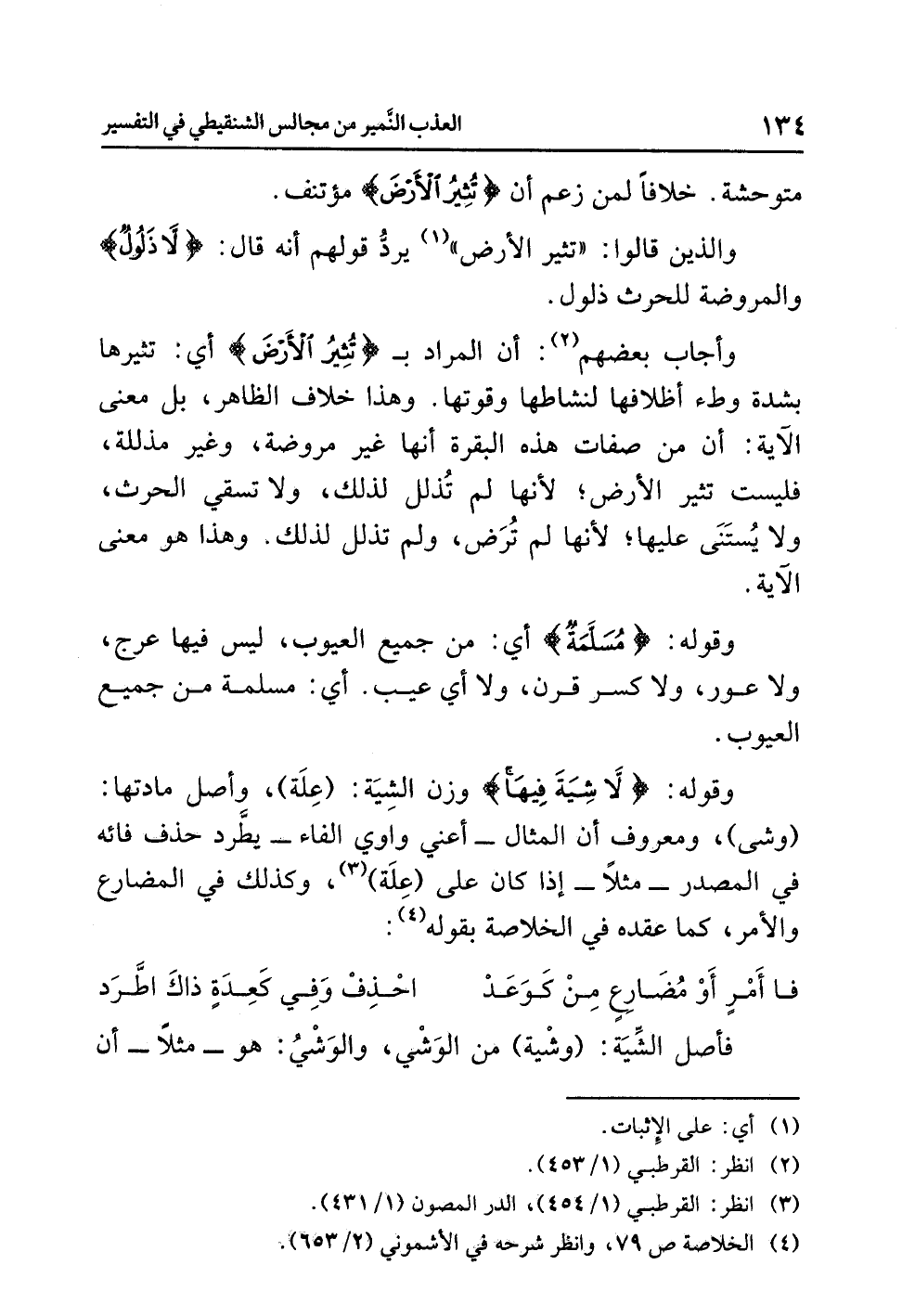 وأجابَ بعضُهم (¬2): أن المرادَ بـ {تُثِيرُ الأَرْضَ} أي: تُثِيرُهَا بشدةِ وطءِ أظلافِها لنشاطِها وقوتِها. وهذا خلافُ الظاهرِ، بل معنى الآيةِ: أن من صفاتِ هذه البقرةِ أنها غيرُ مُرَوَّضَةٍ، وغيرُ مُذَلَّلَةٍ، فليست تثيرُ الأرضَ؛ لأنها لم تُذَلَّلْ لذلك، ولا تَسْقِي الحرثَ، ولا يُسْتَنَى عليها؛ لأنها لم تُرَضْ، ولم تُذَلَّلْ لذلك. وهذا هو معنى الآيةِ.