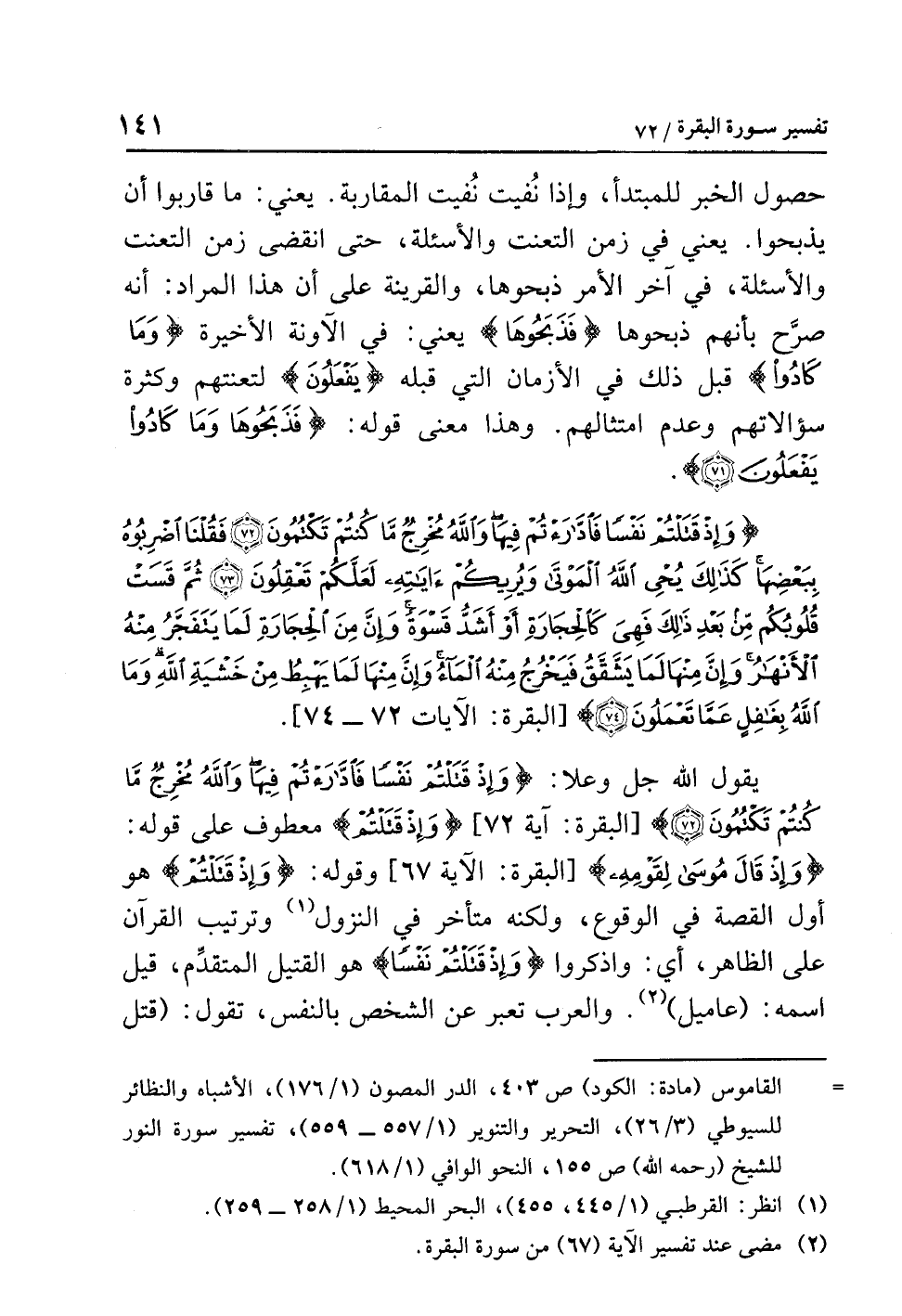 يقول اللَّهُ جل وعلا: {وَإِذْ قَتَلْتُمْ نَفْسًا فَادَّارَأْتُمْ فِيهَا وَاللَّهُ مُخْرِجٌ مَا كُنْتُمْ تَكْتُمُونَ} [البقرة: آية 72] {وَإِذْ قَتَلْتُمْ} معطوفٌ على قولِه: {وَإِذْ قَالَ مُوسَى لِقَوْمِهِ} [البقرة ة الآية 67] وقوله: {وَإِذْ قَتَلْتُمْ} هو أولُ القصةِ في الوقوعِ، ولكنه متأخرٌ في النزولِ (¬1) وترتيبِ القرآنِ على الظاهرِ، أي: وَاذْكُرُوا {وَإِذْ قَتَلْتُمْ نَفْسًا} هو القتيلُ المتقدِّمُ، قيل اسمُه: (عاميل) (¬2). والعربُ تعبرُ عن الشخصِ بالنفسِ، تقول: (قَتَلَ