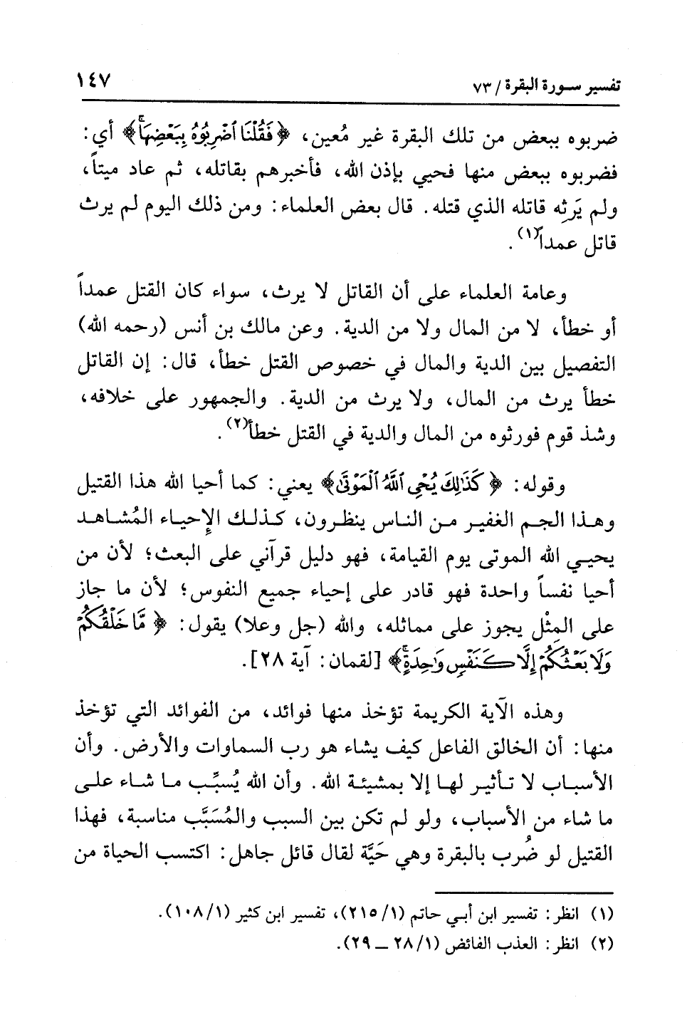 ضربوه ببعضٍ مِنْ تلكَ البقرةِ غيرَ مُعَيَّنٍ {فَقُلْنَا اضْرِبُوهُ بِبَعْضِهَا} أي: فَضَرَبُوهُ ببعضٍ منها فَحَيِيَ بإذنِ اللَّهِ، فأخبرهم بقاتلِه، ثم عادَ مَيِّتًا، ولم يَرثِه قاتلُه الذي قَتَلَهُ. قال بعضُ العلماءِ: ومن ذلك اليومِ لم يَرِثْ قاتلٌ عَمْدًا (¬1).
