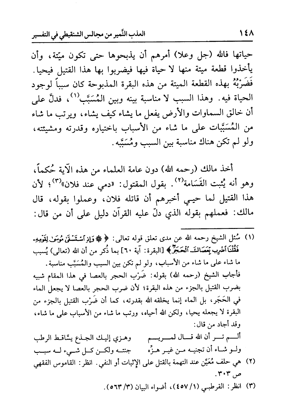 حياتِها فَاللَّهُ (جل وعلا) أَمَرَهُمْ أن يذبحوها حتى تكونَ مَيِّتَةً، وأن يأخذُوا قطعةً ميتةً منها لا حياةَ فيها فيضربوا بها هذا القتيلَ فَيَحْيَا. فَضَرْبُهُ بهذه القطعةِ الميتةِ من هذه البقرةِ المذبوحةِ كان سببًا لوجودِ الحياةِ فيه. وهذا السببُ لا مناسبةَ ببنَه وبينَ المُسَبَّبِ (¬1)، فدلَّ على أن خالقَ السماواتِ والأرضِ يفعلُ ما يشاءُ كيف يشاءُ، وَيُرَتِّبُ ما شاءَ من المُسَبَّباتِ على ما شاءَ من الأسبابِ باختيارِه وقدرتِه ومشيئتِه، ولو لم تكن هناك مناسبةٌ بين السببِ ومُسَبَّبِهِ.
