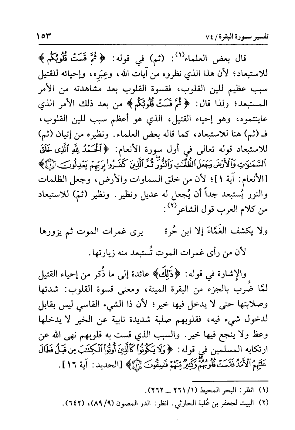 قال بعضُ العلماءِ (¬1): (ثم) في قولِه: {ثُمَّ قَسَتْ قُلُوبُكُمْ} للاستبعادِ؛ لأن هذا الذي نظروه من آياتِ اللَّهِ وعِبَرِه وإحيائِه للقتيلِ سببٌ عظيمٌ لِلِينِ القلوبِ، فقسوةُ القلوبِ بعدَ مشاهدتِه من الأمرِ الْمُسْتَبْعَدِ؛ ولذا قال: {ثُمَّ قَسَتْ قُلُوبُكُم} من بعدِ ذلك الأمرِ الذي عَايَنْتُمُوهُ، وهو إحياءُ القتيلِ، الذي هو أعظمُ سببٍ لِلِينِ القلوبِ، فـ (ثم) هنا للاستبعادِ، كما قاله بعضُ العلماءِ. ونظيرُه من إتيانِ (ثم) للاستبعادِ قولُه تعالى في أولِ سورةِ الأنعامِ: {الْحَمْدُ لِلَّهِ الَّذِي خَلَقَ السَّمَاوَاتِ وَالأَرْضَ وَجَعَلَ الظُّلُمَاتِ وَالنُّورَ ثُمَّ الَّذِينَ كَفَرُوا بِرَبِّهِم يَعْدِلُونَ} [الأنعام: آية 1]؛ لأن مَنْ خَلَق السماواتِ والأرضَ، وجعلَ الظلماتِ والنورَ يُسْتَبْعَدُ جِدًّا أن يُجعل له عديلٌ ونظيرٌ. ونظيرُ (ثمَّ) للاستبعادِ من كلامِ العربِ قولُ الشاعرِ (¬2):