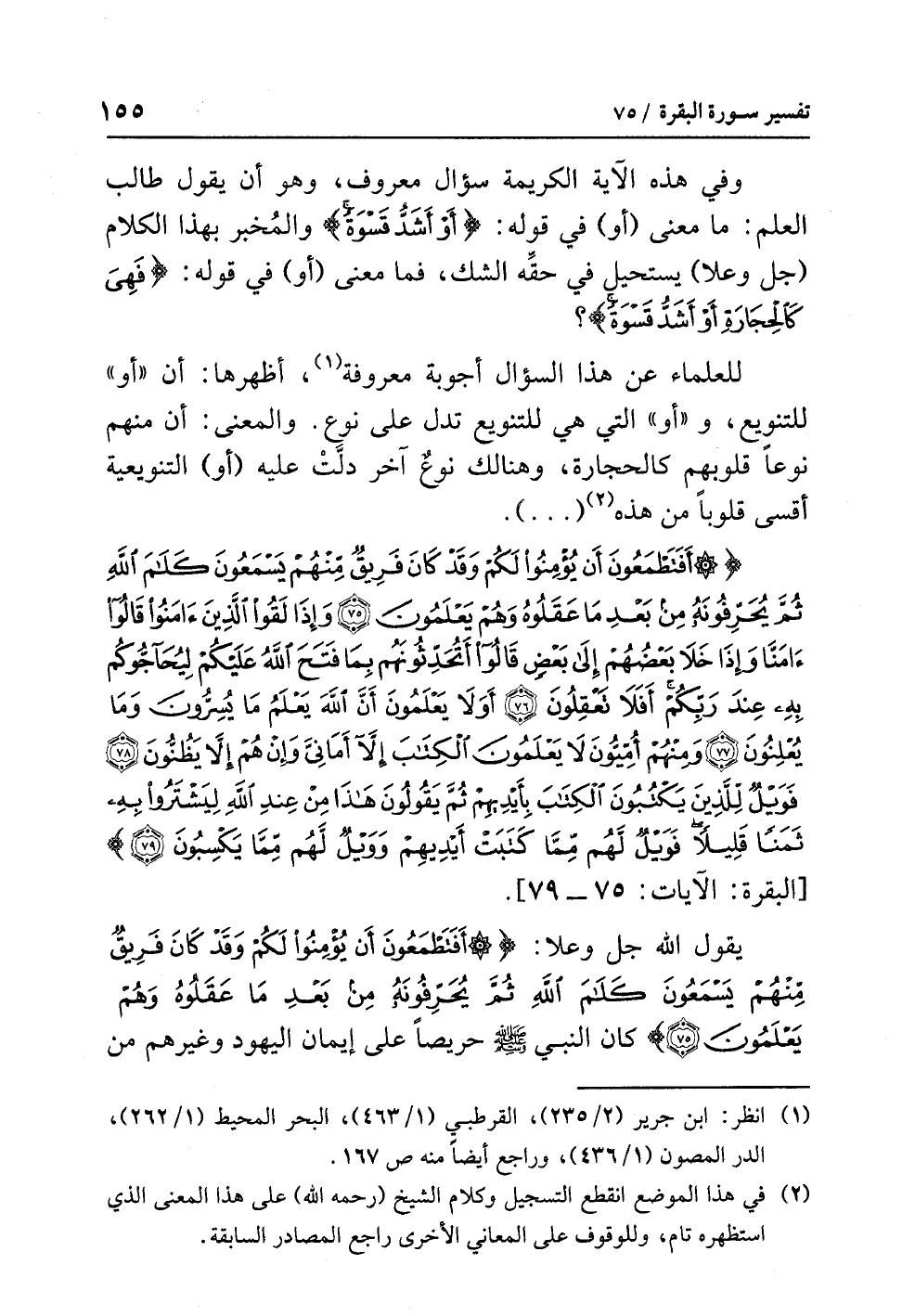 للعلماءِ عن هذا السؤالِ أجوبةٌ معروفةٌ (¬1)، أظهرُها: أن «أو» للتنويعِ، و «أو» التي هي للتنويعِ تدلُّ على نوعٍ. والمعنى: أن منهم نوعًا قلوبُهم كالحجارةِ، وهنالك نوعٌ آخَرُ دلَّتْ عليه (أو) التنويعية أقسى قلوبًا من هذه (¬2) ( ... ).