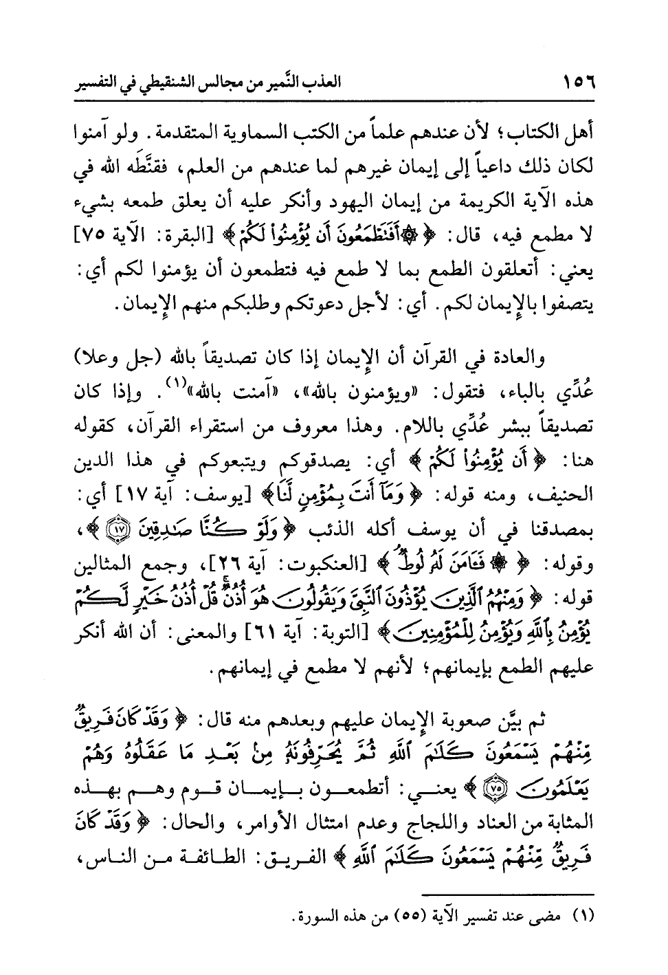 والعادةُ في القرآنِ أن الإيمانَ إذا كان تصديقًا بالله (جل وعلا) عُدِّيَ بالباءِ، فتقول: «ويؤمنون بالله»، «آمنتُ بالله» (¬1). وإذا كان تصديقًا بِبَشَرٍ عُدِّيَ باللامِ. وهذا معروفٌ من استقراءِ القرآنِ، كقولِه هنا: {أَنْ يُؤْمِنُوا لَكُمْ} أي: يصدقوكم ويتبعوكم في هذا الدِّينِ الحنيفِ، ومنه قولُه: {وَمَا أَنتَ بِمُؤْمِنٍ لِّنَا} [يوسف: آية 17] أي: بِمُصَدِّقِنَا في أن يوسفَ أَكَلَهُ الذئبُ {وَلَوْ كُنَّا صَادِقِينَ}، وقولُه: {فَآمَنَ لَهُ لُوطٌ} [العنكبوت: آية 26]، وجمع المثالين قولُه: {وَمِنْهُمُ الَّذِينَ يُؤْذُونَ النَّبِيَّ وَيِقُولُونَ هُوَ أُذُنٌ قُلْ أُذُنُ خَيْرٍ لَّكُمْ يُؤْمِنُ بِاللَّهِ وَيُؤْمِنُ لِلْمُؤْمِنِينَ} [التوبة: آية 61] والمعنى: أن اللَّهَ أَنْكَرَ عليهم الطمعَ بإيمانهم؛ لأنهم لا مطمعَ في إيمانهم.