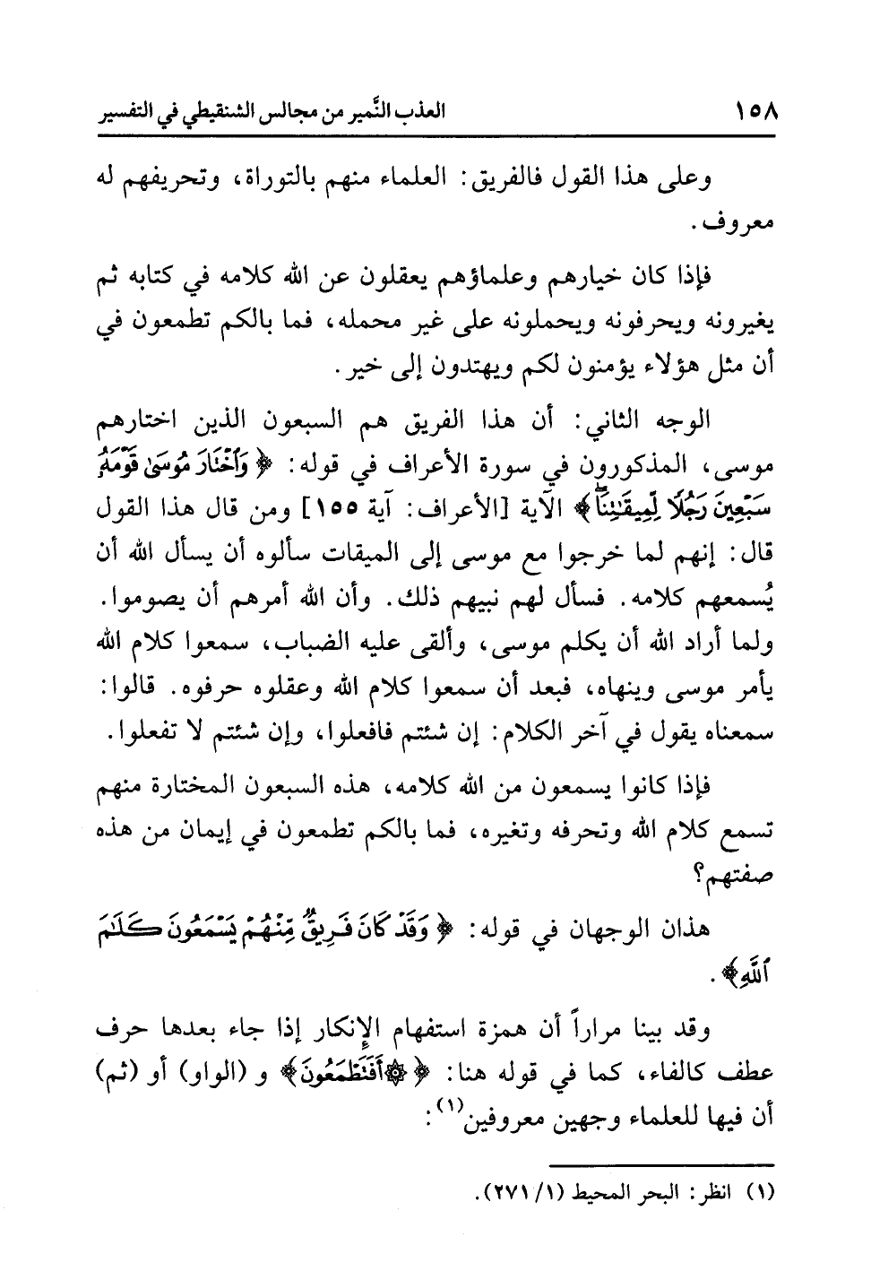 الوجهُ الثاني: أن هذا الفريقَ هم السبعونَ الذين اختارهم موسى، المذكورون في سورةِ الأعرافِ في قولِه: {وَاخْتَارَ مُوسَى قَوْمَهُ سَبْعِينَ رَجُلاً لِّمِيقَاتِنَا} الآيةَ ... [الأعراف: آية 155] وَمَنْ قالَ هذا القولَ قال: إنهم لَمَّا خرجوا مع موسى إلى الميقاتِ سألوه أن يسألَ اللَّهَ أن يُسْمِعَهُمْ كلامَه. فسأل لهم نَبِيُّهُمْ ذلك. وأن اللَّهَ أمرهم أن يَصُومُوا. وَلَمَّا أرادَ اللَّهُ أن يكلمَ موسى، وألقى عليه الضبابَ سَمِعُوا كلامَ اللَّهِ يأمرُ موسى وينهاهُ، فبعدَ أن سَمِعُوا كَلاَمَ اللَّهِ وعقلوه حَرَّفُوهُ. قالوا: سمعناه يقولُ في آخِرِ الكلامِ: إن شئتُم فَافْعَلُوا، وإن شئتُم لا تَفْعَلُوا.