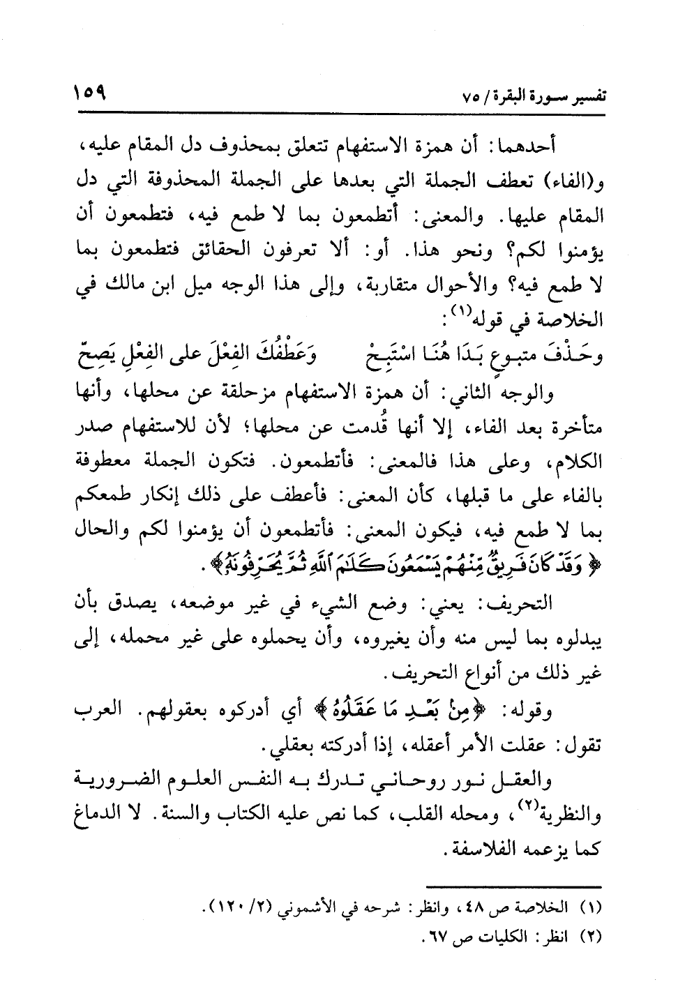 والوجهُ الثاني: أن همزةَ الاستفهامِ مُزَحْلَقَةٌ عن محلِّها، وأنها متأخرةٌ بعد الفاءِ، إلا أنها قُدِّمَتْ عن مَحَلِّهَا؛ لأن للاستفهامِ صدرَ الكلامِ، وعلى هذا فالمعنى: فأتطمعون. فتكونُ الجملةُ معطوفةً بالفاءِ على ما قَبْلَهَا، كأن المعنى: فَأُعْطِفَ على ذلك إنكارُ طَمَعِكُمْ بما لا طمعَ فيه، فيكون المعنى: فأتطمعونَ أن يؤمنوا لكم والحالُ {وَقَدْ كَانَ فَرِيقٌ مِّنْهُمْ يَسْمَعُونَ كَلاَمَ اللَّهِ ثُمَّ يُحَرِّفُونَهُ}.