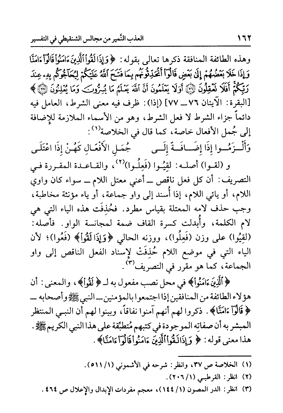 وهذه الطائفةُ المنافقةُ ذَكَرَهَا تعالى بقولِه: {وَإِذَا لَقُوا الَّذِينَ آمَنُوا قَالُوا آمَنَّا وَإِذَا خَلاَ بَعْضُهُمْ إِلَى بَعْضٍ قَالُوا أَتُحَدِّثُونَهُمْ بِمَا فَتَحَ اللَّهُ عَلَيْكُمْ لِيُحَاجُّوكُمْ بِهِ عِنْدَ رَبِّكُمْ أَفَلاَ تَعْقِلُونَ (76) أَوَلاَ يَعْلَمُونَ أَنَّ اللَّهَ يَعْلَمُ مَا يُسِرُّونَ وَمَا يُعْلِنُونَ (77)} [البقرة: الآيتان 76 - 77] (إذا): ظَرْفٌ فيه معنى الشرطِ، العاملُ فيه دائمًا جزاءُ الشرطِ لا فعلَ الشرطِ، وهو مِنَ الأسماءِ الملازمةِ للإضافةِ إلى جُمَلِ الأفعالِ خاصةً، كما قال في الخلاصةِ (¬1):