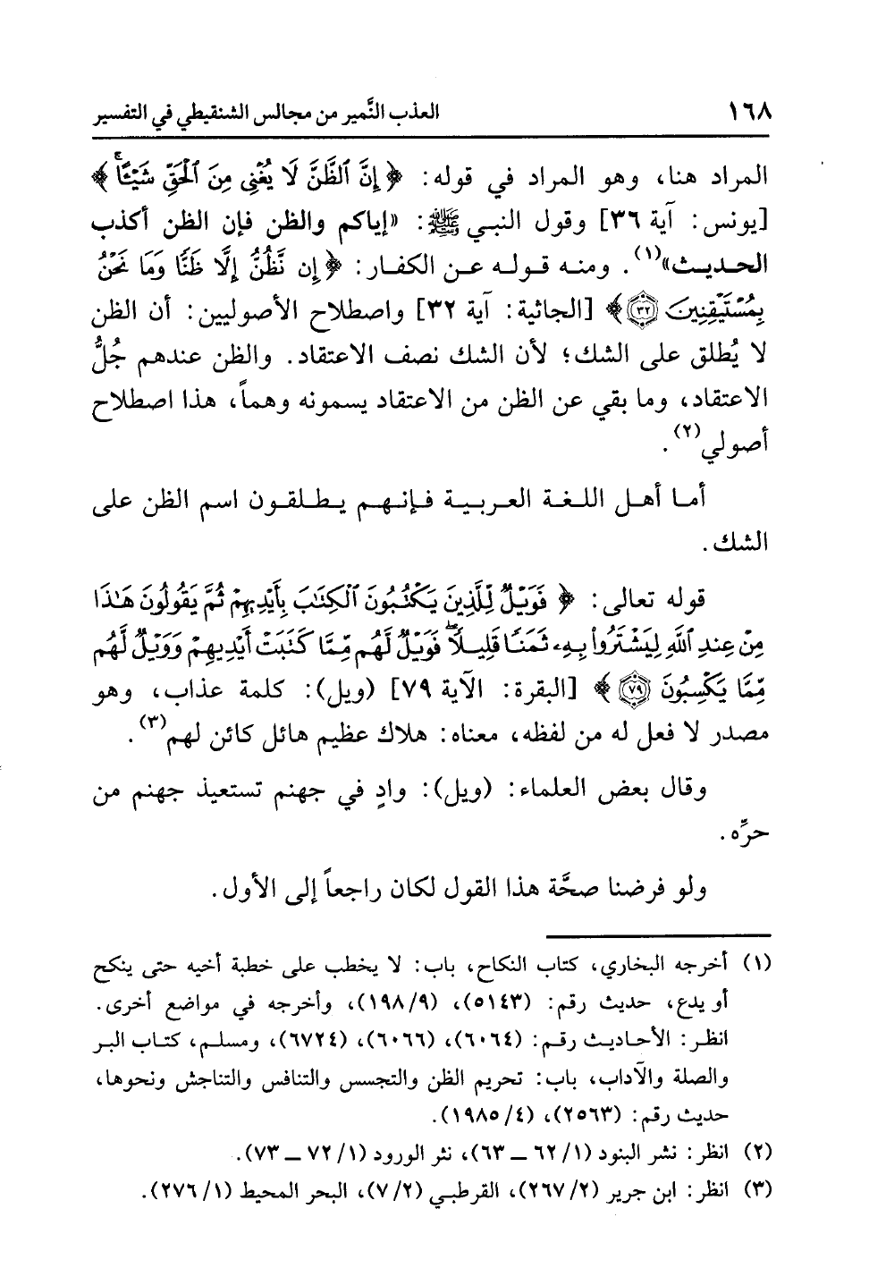 المرادُ هنا، وهو المرادُ في قوله: {إِنَّ الظَّنَّ لاَ يُغْنِي مِنَ الْحَقِّ شَيْئًا} [يونس: آية 36] وقولِ النبيِّ - صلى الله عليه وسلم -: «إِيَّاكُمْ وَالظَّنَّ فَإِنَّ الظَّنَّ أَكْذَبُ الْحَدِيثِ» (¬1). ومنه قولُه عن الكفارِ: {إِن نَّظُنُّ إِلاَّ ظَنًّا وَمَا نَحْنُ بِمُسْتَيْقِنِينَ} [الجائية: آية 32] واصطلاحُ الأُصُولِيِّينَ: أن الظنَّ لا يُطْلَقُ على الشكِّ؛ لأن الشكَّ نصفُ الاعتقادِ. والظنُّ عندهم جُلُّ الاعتقادِ، وما بَقِيَ عن الظنِّ من الاعتقادِ يُسَمُّونَهُ وَهْمًا، هذا اصطلاحٌ أُصُولِيٌّ (¬2).