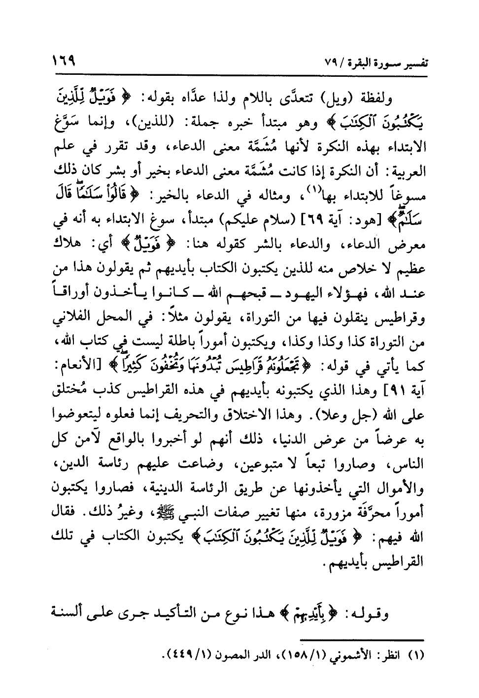 ولفظةُ (ويل) تتعدَّى باللامِ؛ وَلِذَا عَدَّاهُ بقولِه: {فَوَيْلٌ لِّلَّذِينَ يَكْتُبُونَ الْكِتَابَ} وهو مبتدأٌ خبرُه جملةُ: (للذين)، وإنما سَوَّغ الابتداء بهذه النكرةِ لأنها مُشَمَّةٌ معنى الدعاءِ، وقد تقررَ في علمِ العربيةِ: أن النكرةَ إذا كانت مُشَمَّةً معنى الدعاءِ بخيرٍ أو بِشَرٍّ كان ذلك مُسَوِّغًا للابتداءِ بها (¬1)، ومثالُه في الدعاءِ بالخيرِ: {قَالُوا سَلاَمًا قَالَ سَلاَمٌ} [هود: آية 69] (سلامٌ عليكم) مبتدأٌ، سَوَّغَ الابتداءَ به أنه في معرضِ الدعاءِ، والدعاءُ بالشرِّ كقولِه هنا: {فَوَيْلٌ} أي: هلاكٌ عظيمٌ لا خلاصَ منه للذين يكتبونَ الكتابَ بأيديهم ثم يقولونَ هذا من عندِ اللَّهِ، فهؤلاء اليهودُ - قَبَّحَهُمُ اللَّهُ - كانوا يأخذونَ أوراقًا وقراطيسَ ينقلونَ فيها من التوراةِ، يقولون مثلاً: في المحلِّ الفلانيِّ من التوراةِ كذا وكذا وكذا، ويكتبونَ أمورًا باطلةً ليست في كتابِ اللَّهِ، كما يأتي في قولِه: {تَجْعَلُونَهُ قَرَاطِيسَ تُبْدُونَهَا وَتُخْفُونَ كَثِيرًا} [الأنعام: آية 91] وهذا
