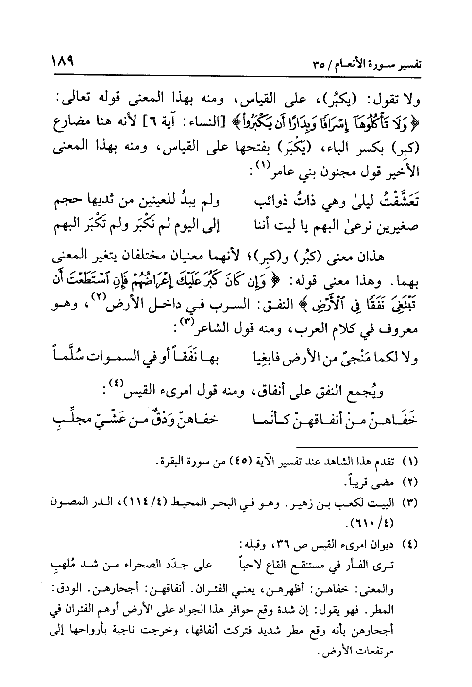 ولا تقول: (يكبُر)، على القياسِ، ومنه بهذا المعنى قولُه تعالى: {وَلاَ تَأْكُلُوهَا إِسْرَافًا وَبِدَارًا أَنْ يَكْبَرُوا} [النساء: آية 6] لأنه هنا مضارعُ (كبِر) بكسرِ الباءِ، (يَكْبَر) بفتحِها على القياسِ، ومنه بهذا المعنى الأخيرِ قولُ مجنونِ بَنِي عامر (¬1):