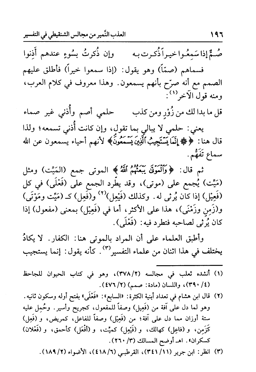 ثم قال: {وَالْمَوْتَى يَبْعَثُهُمُ اللَّهُ} الموتى جَمْعُ (المَيِّتِ) ومثل (مَيِّتٍ) يُجْمَعُ على (مَوْتَى)، وقد يَطَّرِدُ الجمعُ على (فَعْلَى) في كُلِّ (فَعِيل) إذا كان يُرْثَى له. وكذلك (فَيْعِل) (¬2) و (فَعِل) كـ (مَيِّتٍ ومَوْتَى) و (زَمِنٍ وَزَمْنَى)، هذا على الأَكْثَرِ، أما في (فَعِيل) بمعنَى (مفعول) إذا كان يُرْثَى لصاحبِه فَتَطَّرِدُ فيه: (فَعْلَى).
