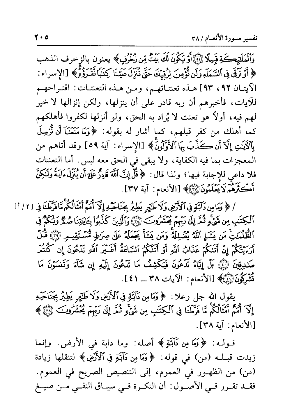 [2/أ] / {وَمَا مِنْ دَابَّةٍ فِي الأَرْضِ وَلاَ طَائِرٍ يَطِيرُ بِجَنَاحَيْهِ إِلاَّ أُمَمٌ أَمْثَالُكُم مَّا فَرَّطْنَا فِي الكِتَابِ مِنْ شَيْءٍ ثُمَّ إِلَى رَبِّهِمْ يُحْشَرُونَ (38) وَالَّذِينَ كَذَّبُوا بِآيَاتِنَا صُمٌّ وَبُكْمٌ فِي الظُّلُمَاتِ مَنْ يَشَإِ اللَّهُ يُضْلِلْهُ وَمَنْ يَشَأْ يَجْعَلْهُ عَلَى صِرَاطٍ مُّسْتَقِيمٍ (39) قُلْ أَرَأَيْتُكُمْ إِنْ أَتَاكُمْ عَذَابُ اللَّهِ أَوْ أَتَتْكُمُ السَّاعَةُ أَغَيْرَ اللَّهِ تَدْعُونَ إِنْ كُنْتُمْ صَادِقِينَ (40) بَلْ إِيَّاهُ تَدْعُونَ فَيَكْشِفُ مَا تَدْعُونَ إِلَيْهِ إِنْ شَاءَ وَتَنسَوْنَ مَا تُشْرِكُونَ (41)} [الأنعام: الآيات 38 - 41].