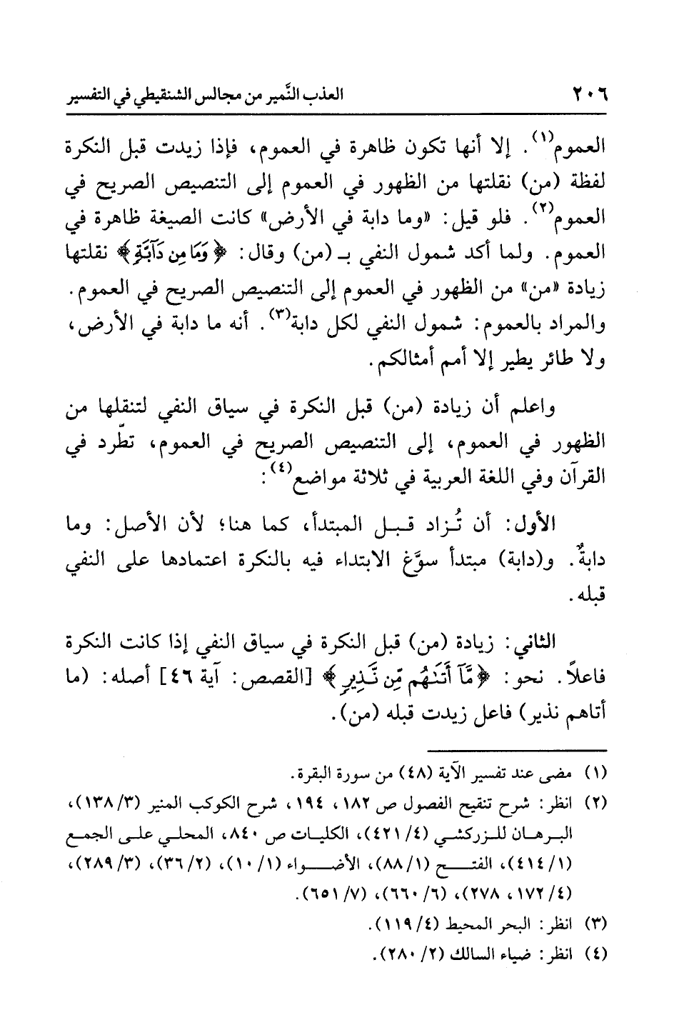 وَاعْلَمْ أن زيادةَ (من) قبلَ النكرةِ في سياقِ النفيِ لِتَنْقُلَهَا من الظهورِ في العمومِ إلى التنصيصِ الصريحِ في العمومِ، تَطَّرِدُ في القرآنِ وفي اللغةِ العربيةِ في ثلاثةِ مَوَاضِعَ (¬4):