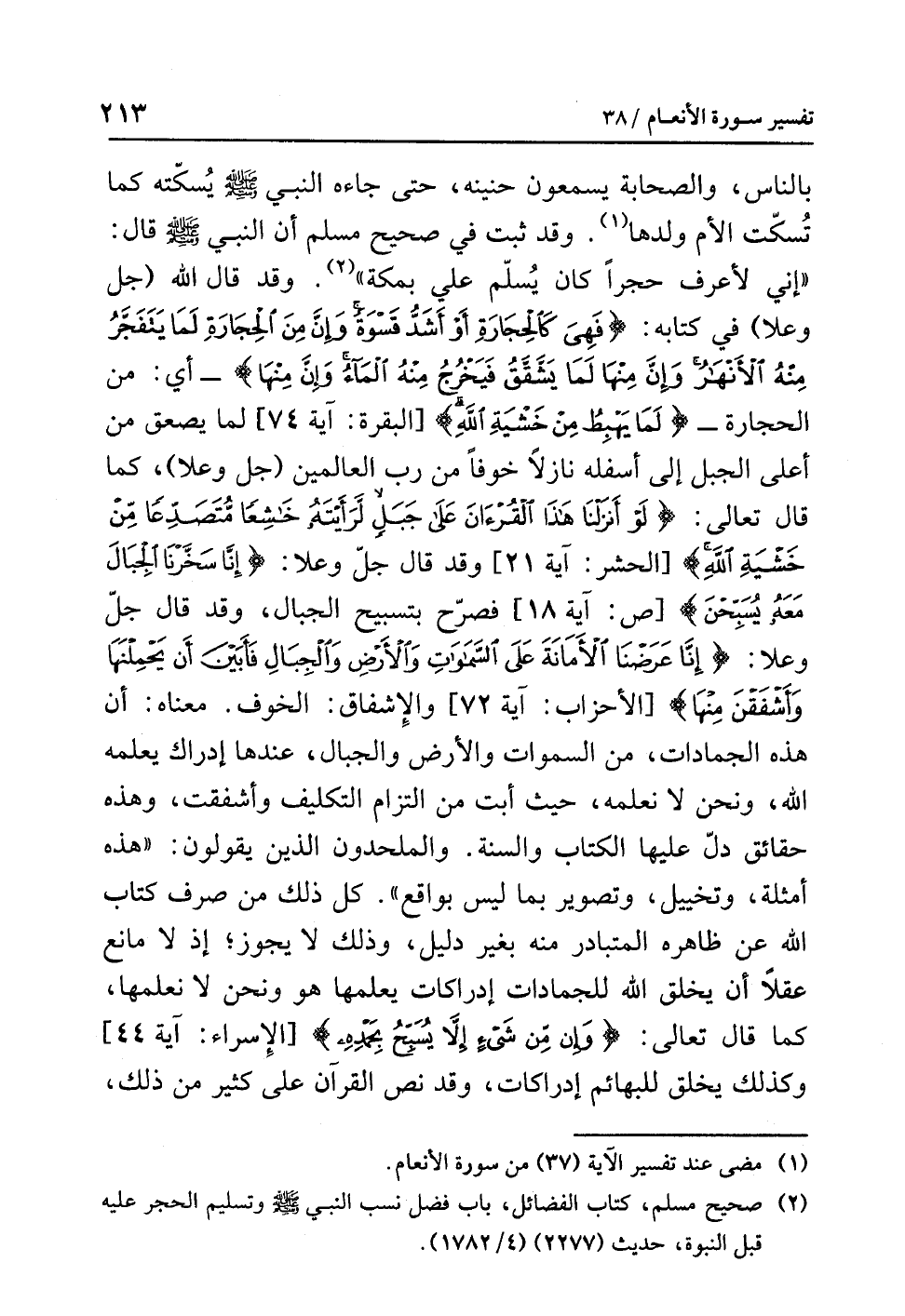 وقد قال اللَّهُ (جل وعلا) في كتابِه: {فَهِيَ كَالْحِجَارَةِ أَوْ أَشَدُّ قَسْوَةً وَإِنَّ مِنَ الْحِجَارَةِ لَمَا يَتَفَجَّرُ مِنْهُ الأَنْهَارُ وَإِنَّ مِنْهَا لَمَا يَشَّقَّقُ فَيَخْرُجُ مِنْهُ الْمَاءُ وَإِنَّ مِنْهَا} - أي: مِنَ الحجارةِ - {لَمَا يَهْبِطُ مِنْ خَشْيَةِ اللَّهِ} [البقرة: آية 74] لما يُصْعَقُ مِنْ أَعْلَى الجبلِ إلى أسفلِه نازلاً خوفًا من رَبِّ العالمين (جل وعلا)، كما قال تعالى: {لَوْ أَنْزَلْنَا هَذَا الْقُرْآنَ عَلَى جَبَلٍ لَّرَأَيْتَهُ خَاشِعًا مُّتَصَدِّعًا مِّنْ خَشْيَةِ اللَّهِ} [الحشر: آية 21] وقد قال جل وعلا: {إِنَّا سَخَّرْنَا الْجِبَالَ مَعَهُ يُسَبِّحْنَ} [ص: آية 18] فصرَّح بتسبيحِ الجبالِ، وقد قال جل وعلا: {إِنَّا عَرَضْنَا الْأَمَانَةَ عَلَى السَّمَاوَاتِ وَالْأَرْضِ وَالْجِبَالِ فَأَبَيْنَ أَنْ يَحْمِلْنَهَا وَأَشْفَقْنَ مِنْهَا} [الأحزاب: آية 72] والإشفاقُ: الخوفُ. معناه: أن هذه الجماداتِ، من السمواتِ والأرضِ والجبالِ، عندها إدراكٌ يعلمُه اللَّهُ، ونحن لا نعلمُه، حيث أَبَتْ من التزامِ التكليفِ وَأَشْفَقَتْ، وهذه حقائقُ دَلَّ عليها الكتابُ والسنةُ. وَالْمُلْحِدُونَ الذين يقولونَ: «هذه أمثلةٌ وتخييلٌ وتصويرٌ بما ليس بواقعٍ».