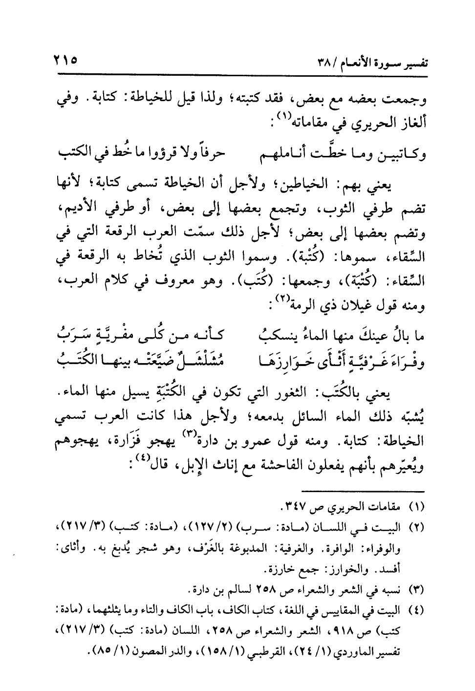 (¬4) البيت في المقاييس في اللغة، كتاب الكاف، باب الكاف والتاء وما يثلثهما، (مادة: كتب) ص (918)، الشعر والشعراء ص 258، اللسان (مادة: كتب) (3/ 217)، تفسير الماوردي (1/ 24)، القرطبي (1/ 158)، والدر المصون (1/ 85).