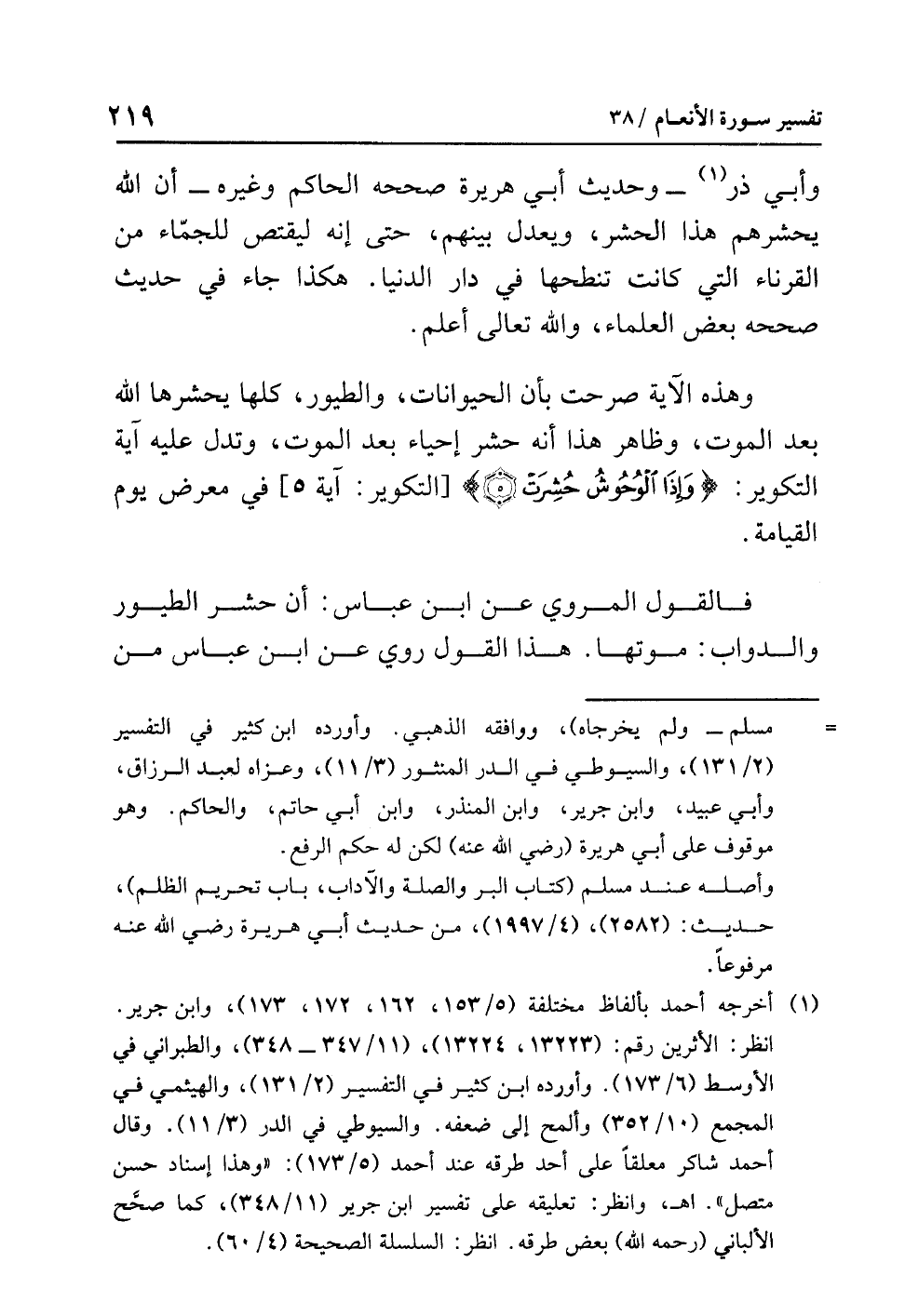 فالقولُ الْمَرْوِيُّ عن ابنِ عباسٍ: أن حشرَ الطيورِ والدوابِّ: مَوْتُهَا. هذا القولُ رُوِيَ عن ابنِ عباسٍ من