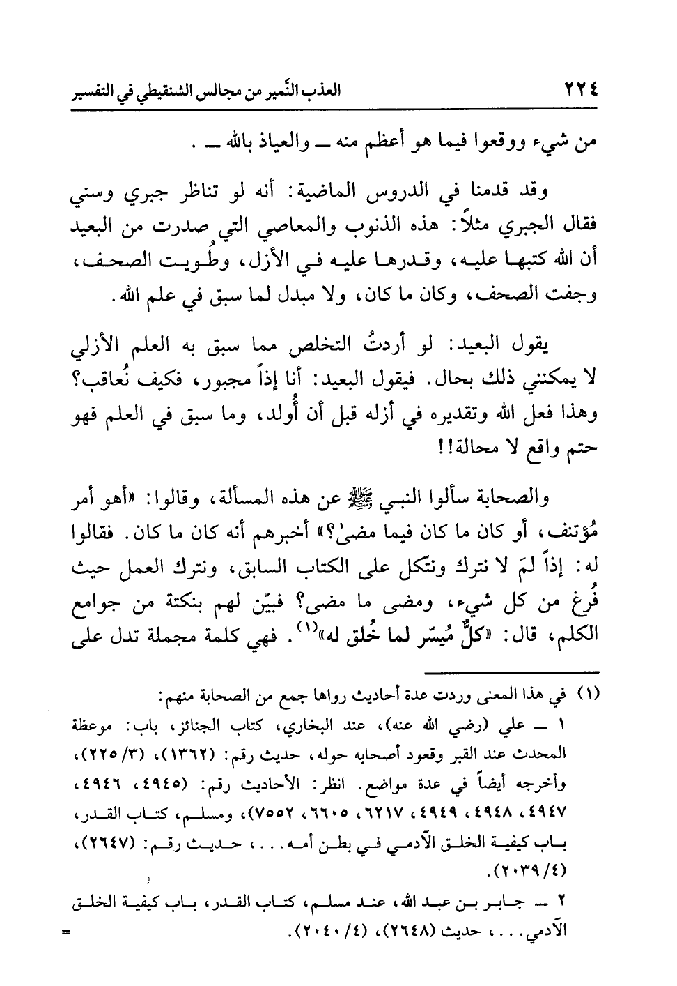 وقد قَدَّمْنَا: أنه لو تَنَاظَرَ جَبْرِيٌّ وَسُنِّيٌّ فقال الجبريُّ مثلاً: هذه الذنوبُ والمعاصي التي صَدَرَتْ من البعيدِ أن اللَّهَ كَتَبَهَا عليه، وَقَدَّرَهَا عليه في الأزلِ، وَطُوِيَتْ الصحفُ، وَجَفَّتِ الصحفُ، وكان ما كان، ولا مبدلَ لِمَا سَبَقَ في عِلْمِ اللَّهِ.