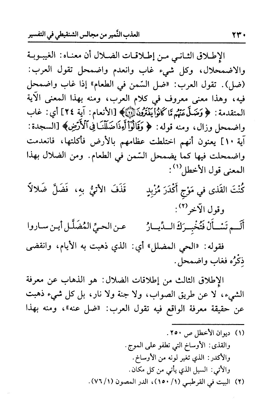 الإطلاقُ الثاني من إطلاقاتِ الضلالِ أن معناه: الغيبوبةُ والاضمحلالُ، وكلُّ شيءٍ غابَ وانعدمَ واضمحلَّ تقولُ العربُ: (ضل). تقول العربُ: «ضَلَّ السَّمْنُ فِي الطعامِ» إذا غابَ واضمحلَّ فيه، وهذا معنًى معروفٌ في كلامِ العربِ، ومنه بهذا المعنى الآيةُ المتقدمةُ: {وَضَلَّ عَنْهُم مَّا كَانُوا يَفْتَرُونَ} [الأنعام: آية 24] أي: غَابَ وَاضْمَحَلَّ وَزَالَ، ومنه قولُه: {وَقَالُوا أَئِذَا ضَلَلْنَا فِي الْأَرْضِ} [السجدة: آية 10] يَعْنُونَ أنهم اخْتَلَطَتْ عظامُهم بالأرضِ فَأَكَلَتْهَا فَانْعَدَمَتْ وَاضْمَحَلَّتْ فيها كما يضمحلُ السَّمْنُ في الطعامِ. ومن الضلالِ بهذا المعنى قولُ الأَخْطَلِ (¬1):