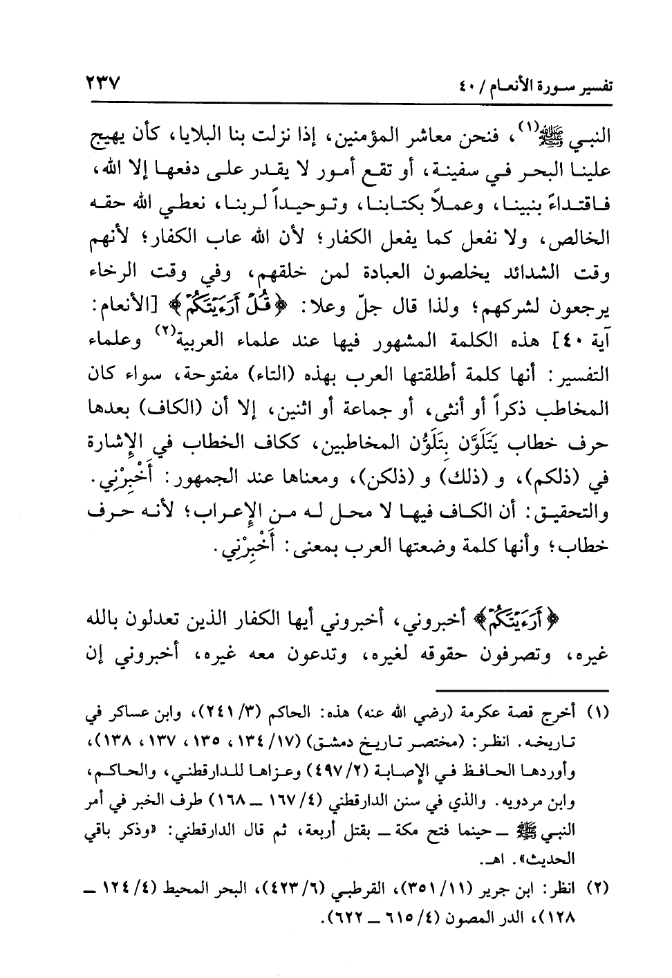 فنحن معاشرَ المؤمنين، إذا نَزَلَتْ بنا البلايا، كأن يهيجَ علينا البحرُ في سفينةٍ، أو تقعَ أمورٌ لا يقدرُ على دَفْعِهَا إلا اللَّهُ، فاقتداءً بنبينا، وعملاً بكتابِنا، وتوحيدًا لِرَبِّنَا، نُعْطِي اللَّهَ حَقَّهُ الخالصَ، ولا نفعلُ كما يفعلُ الكفارُ؛ لأن اللَّهَ عابَ الكفارَ؛ لأنهم وقتَ الشدائدِ يُخْلِصُونَ العبادةَ لِمَنْ خَلَقَهُمْ، وفي وقتِ الرخاءِ يرجعون لِشِرْكِهِمْ؛ ولذا قال جل وعلا: {قُلْ أَرَأَيْتَكُمْ} [الأنعام: آية 40] هذه الكلمةُ المشهورُ فيها عندَ علماءِ العربيةِ (¬2) وعلماءِ التفسيرِ: أنها كلمةٌ أَطْلَقَتْهَا العربُ بهذه (التاء) مفتوحةً، سواء كان الْمُخَاطَبُ ذَكَرًا أو أُنْثَى، أو جماعةً أو اثنين، إلا أن (الكافَ) بعدَها حرفُ خطابٍ يَتَلَوَّنُ بِتَلَوُّنِ الْمُخَاطَبِينَ، ككافِ الخطابِ في الإشارةِ في (ذلكم)، و (ذلك) و (ذلكن)، ومعناها عندَ الجمهورِ: أَخْبِرْنِي. والتحقيقُ: أن الكافَ فيها لا محلَّ له من الإعرابِ؛ لأنه حرفُ خطابٍ؛ وأنها كلمةٌ وَضَعَتْهَا العربُ بمعنى: أَخْبِرْنِي.