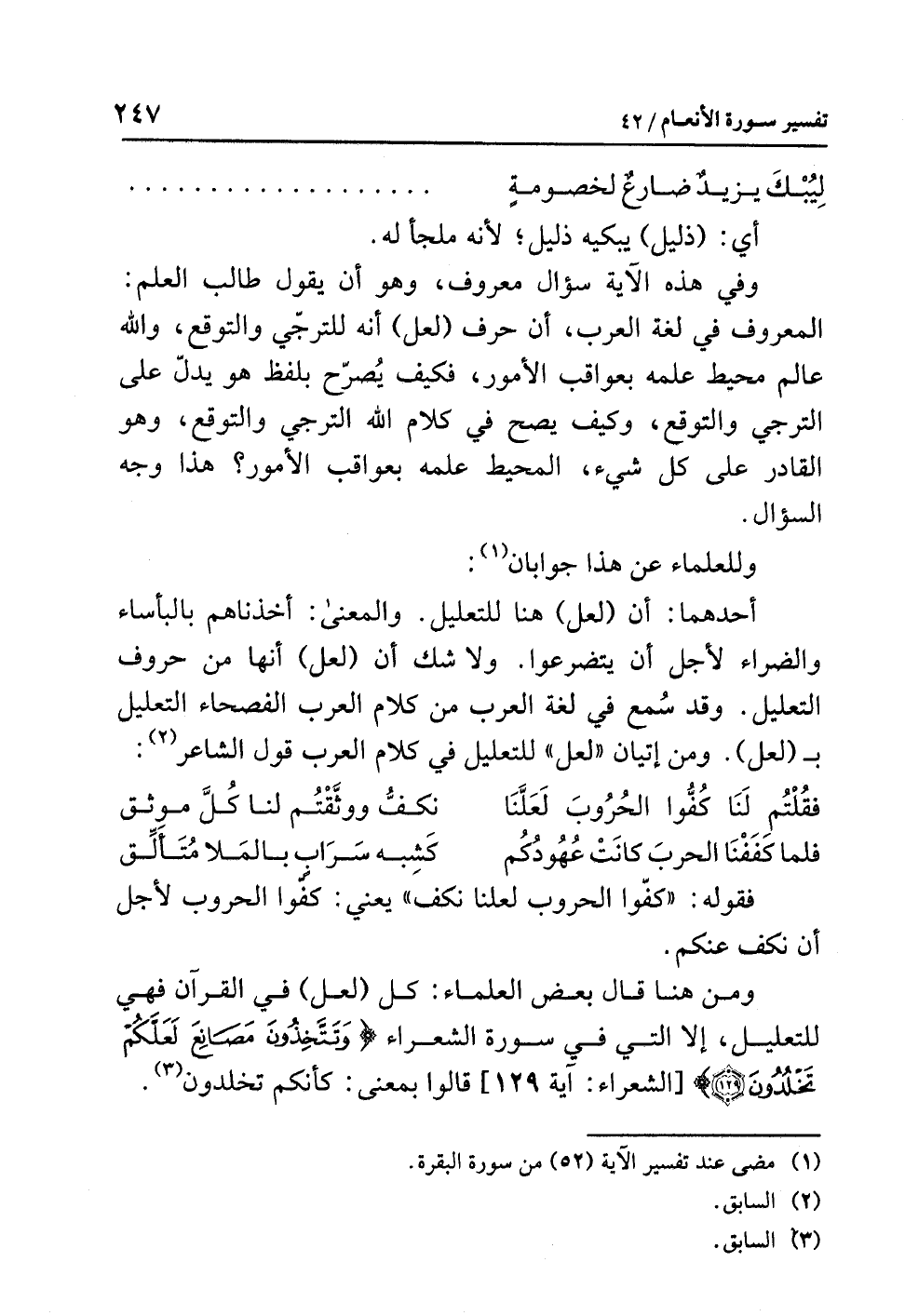أحدُهما: أن (لَعَلَّ) هنا للتعليلِ. والمعنى: أَخَذْنَاهُمْ بالبأساءِ والضراءِ لأجلِ أن يَتَضَرَّعُوا. ولا شكَّ أن (لعلَّ) أنها من حروفِ التعليلِ. وقد سُمِعَ في لغةِ العربِ من كلامِ العربِ الفصحاءِ التعليلُ بـ (لعل). ومن إتيانِ «لعل» للتعليلِ في كلامِ العربِ قولُ الشاعرِ (¬2):