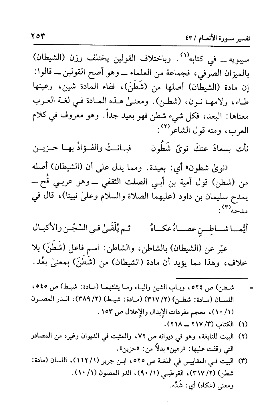 سِيبَوَيْهِ - في كتابِه (¬1). وباختلافِ القولين يختلفُ وَزْنُ (الشيطانِ) بالميزانِ الصرفيِّ، فجماعةٌ مِنَ العلماءِ - وهو أَصَحُّ القولين - قالوا: إن مادةَ (الشيطانِ) أصلُها من (شَطَنَ)، ففاءُ المادةِ شِينٌ، وعينُها طاءٌ، وَلاَمُهَا نونٌ، (شَطَنَ). ومعنى هذه المادةِ في لغةِ العربِ معناها: البعدُ، فَكُلُّ شيءٍ شَطَنَ فهو بعيدٌ جِدًّا. وهو معروفٌ في كلامِ العربِ، ومنه قولُ الشاعرِ (¬2):