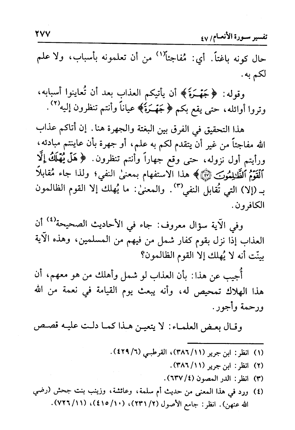 هذا التحقيقُ في الفرقِ بين البغتةِ والجهرةِ هنا. إن أتاكم عذابُ اللَّهِ مفاجئًا من غيرِ أن يتقدمَ لكم به علم، أو جهرةً بأن عَايَنْتُمْ مبادئَه، ورأيتم أولَ نزولِه، حتى وقعَ جهارًا وأنتم تنظرونَ. {هَلْ يُهْلَكُ إِلاَّ الْقَوْمُ الظَّالِمُونَ} هذا الاستفهامُ بمعنى النفيِ؛ ولذا جَاءَ مُقَابِلاً بـ (إلا) التي تُقَابِلُ النفيَ (¬3). والمعنى: ما يُهْلَكُ إلا القومُ الظالمونَ الكافرونَ.