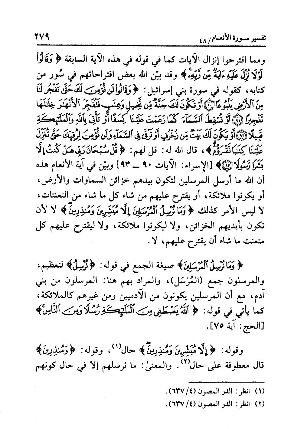 ومما اقترحوا إنزالُ الآياتِ كما في قولِه في هذه الآيةِ السابقةِ: {وَقَالُوا لَوْلاَ أُنزِلَ عَلَيْهِ آيَاتٌ مِّن رَّبِّهِ} وقد بَيَّنَ اللَّهُ بعضَ اقتراحاتِهم في سُورٍ من كتابِه، كقولِه في سورةِ بني إسرائيلَ: {وَقَالُوا لَنْ نُؤْمِنَ لَكَ حَتَّى تَفْجُرَ لَنَا مِنَ الأرْضِ يَنْبُوعًا (90) أَوْ تَكُونَ لَكَ جَنَّةٌ مِنْ نَخِيلٍ وَعِنَبٍ فَتُفَجِّرَ الأنْهَارَ خِلالَهَا تَفْجِيرًا (91) أَوْ تُسْقِطَ السَّمَاءَ كَمَا زَعَمْتَ عَلَيْنَا كِسَفًا أَوْ تَأْتِيَ بِاللَّهِ وَالْمَلائِكَةِ قَبِيلاً (92) أَوْ يَكُونَ لَكَ بَيْتٌ مِنْ زُخْرُفٍ أَوْ تَرْقَى فِي السَّمَاءِ وَلَنْ نُؤْمِنَ لِرُقِيِّكَ حَتَّى تُنَزِّلَ عَلَيْنَا كِتَابًا نَقْرَؤُهُ} قال الله له: قل لهم: {قُلْ سُبْحَانَ رَبِّي هَلْ كُنْتُ إِلاَّ بَشَرًا رَسُولاً} [الإسراء: الآيات 90 - 93] وَبَيَّنَ في آيةِ الأنعامِ هذه أن اللَّهَ ما أرسلَ المرسلين لتكونَ بيدهم خزائنُ السماواتِ والأرضِ، أو يكونوا ملائكةً، أو يقترحَ عليهم مَنْ شَاءَ كُلَّ ما شاء من التعنتاتِ، لا ليس الأمرُ كذلك: {وَمَا نُرْسِلُ الْمُرْسَلِينَ إِلاَّ مُبَشِّرِينَ وَمُنْذِرِينَ} لا لأن تكونَ بأيديهم الخزائنُ، ولا ليكونوا ملائكةً، ولا ليقترحَ عليهم كُلُّ متعنتٍ ما شاءَ أن يقترحَ عليهم، لا.