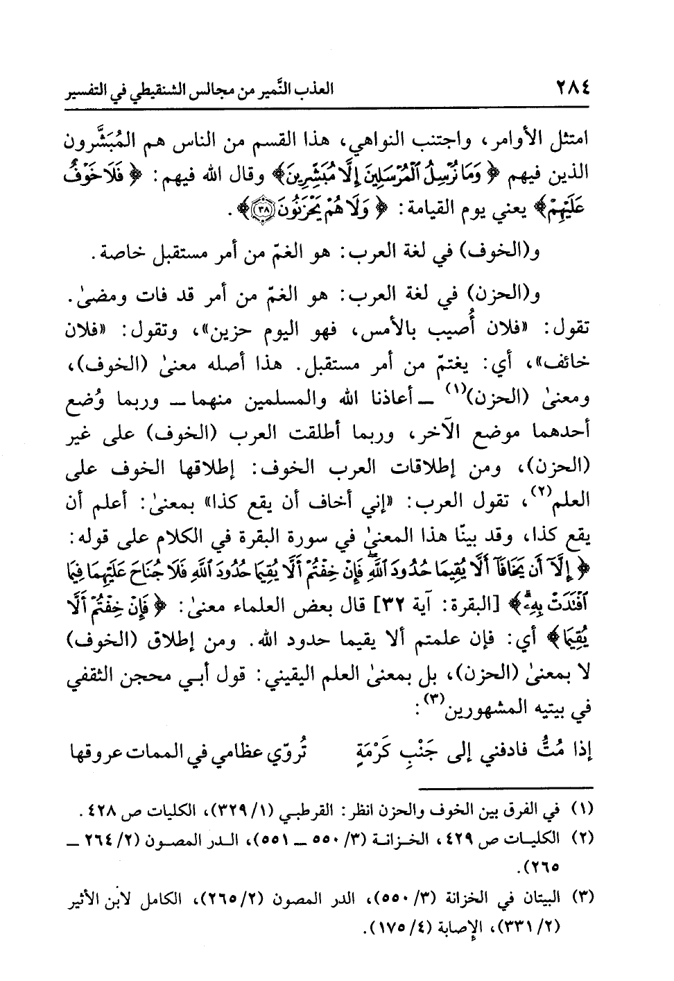 و (الحزنُ) في لغةِ العربِ: هو الغمُّ من أمرٍ قد فاتَ وَمَضَى. تقولُ: «فلانٌ أُصِيبَ بالأمسِ، فهو اليومَ حزينٌ» وتقولُ: «فلانٌ خائفٌ» أي: يَغْتَمُّ مِنْ أمرٍ مستقبلٍ. هذا أصلُه معنى (الخوفِ) ومعنى (الحزنِ) (¬1) - أَعَاذَنَا اللَّهُ والمسلمين منهما - وربما وُضِعَ أحدُهما موضعَ الآخَرِ، وربما أَطْلَقَتِ العربُ (الخوفَ) على غيرِ (الحزنِ)، وَمِنْ إطلاقاتِ العربِ الخوفَ: إطلاقُها الخوفَ على العلم (¬2)، تقولُ العربُ: «إِنِّي أخافُ أن يقعَ كذا» بمعنى: أعلمُ أن يقعَ كذا، وقد بَيَّنَّا هذا المعنَى في سورةِ البقرةِ في الكلامِ على قولِه: {إِلاَّ أَنْ يَخَافَا أَلاَّ يُقِيمَا حُدُودَ اللَّهِ فَإِنْ خِفْتُمْ أَلاَّ يُقِيمَا حُدُودَ اللَّهِ فَلاَ جُنَاحَ عَلَيْهِمَا فِيمَا افْتَدَتْ بِهِ} [البقرة: آية 229] قال بعضُ العلماءِ معنَى: {فَإِنْ خِفْتُمْ أَلاَّ يُقِيمَا} أي: فإن عَلِمْتُمْ ألاَّ يقيما حدودَ اللَّهِ. ومن إطلاقِ (الخوفِ) لاَ بمعنَى (الحزنِ)، بل بمعنَى العلمِ اليقينيِّ: قولُ أبي مِحْجَنٍ الثقفيِّ في بَيْتَيْهِ المشهورين (¬3):