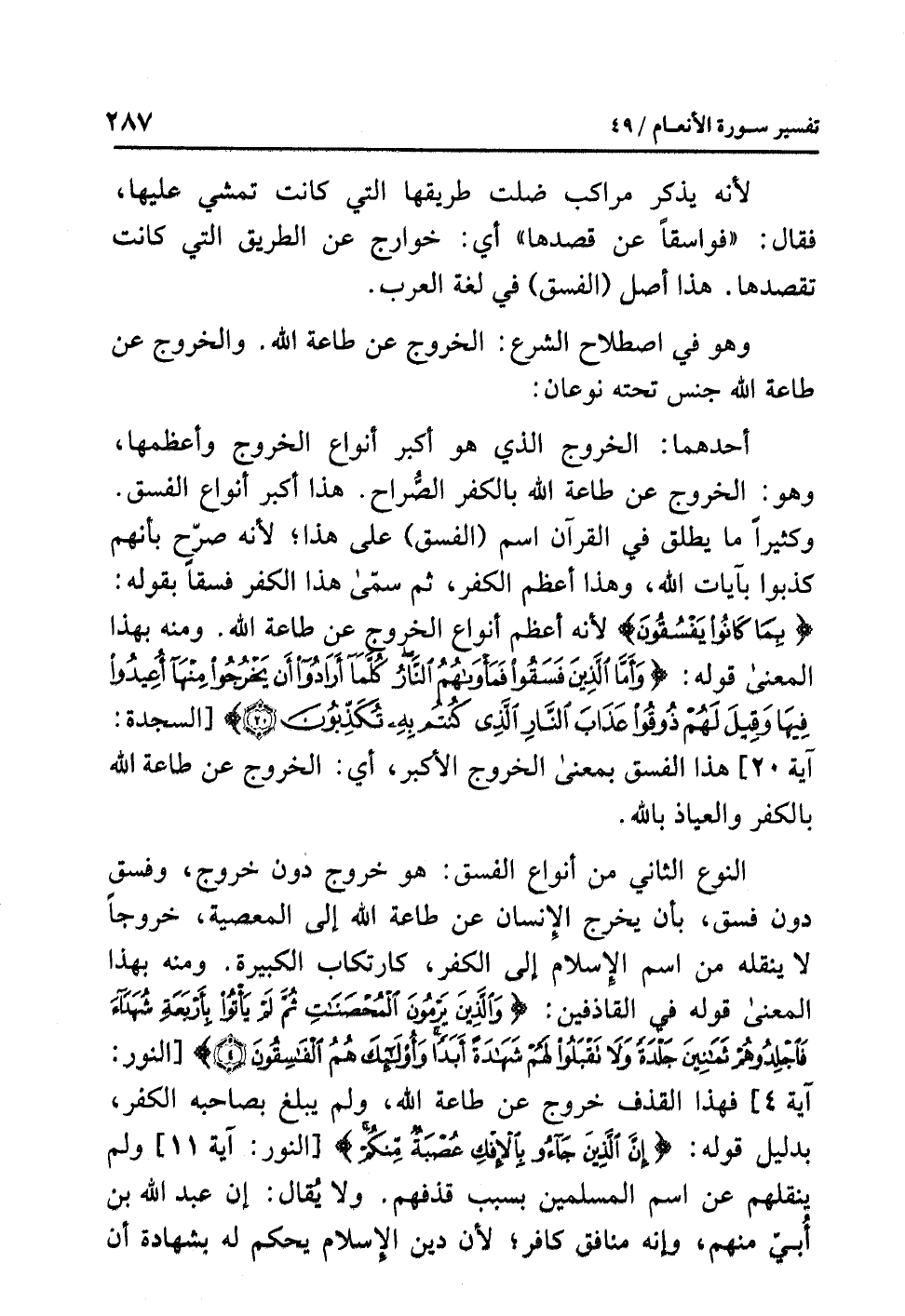 أحدُهما: الخروجُ الذي هو أكبرُ أنواعِ الخروجِ وأعظمُها، وهو: الخروجُ عن طاعةِ اللَّهِ بالكفرِ الصُّراحِ. هذا أكبرُ أنواعِ الفسقِ. وكثيرًا ما يُطْلَقُ في القرآنِ اسمُ (الفسقِ) على هذا؛ لأنه صَرَّحَ بأنهم كَذَّبُوا بآياتِ اللَّهِ، وهذا أعظمُ الكفرِ، ثم سَمَّى هذا الكفرَ فِسْقًا بقولِه: {بِمَا كَانُوا يَفْسُقُونَ} لأنه أعظمُ أنواعِ الخروجِ عن طاعةِ اللَّهِ. ومنه بهذا المعنى قولُه: {وَأَمَّا الَّذِينَ فَسَقُوا فَمَأْوَاهُمُ النَّارُ كُلَّمَا أَرَادُوا أَنْ يَخْرُجُوا مِنْهَا أُعِيدُوا فِيهَا وَقِيلَ لَهُمْ ذُوقُوا عَذَابَ النَّارِ الَّذِي كُنْتُمْ بِهِ تُكَذِّبُونَ} [السجدة: آية 20] هذا الفسقُ بمعنَى الخروجِ الأكبرِ، أي: الخروج عن طاعةِ اللَّهِ بالكفرِ والعياذِ بالله.