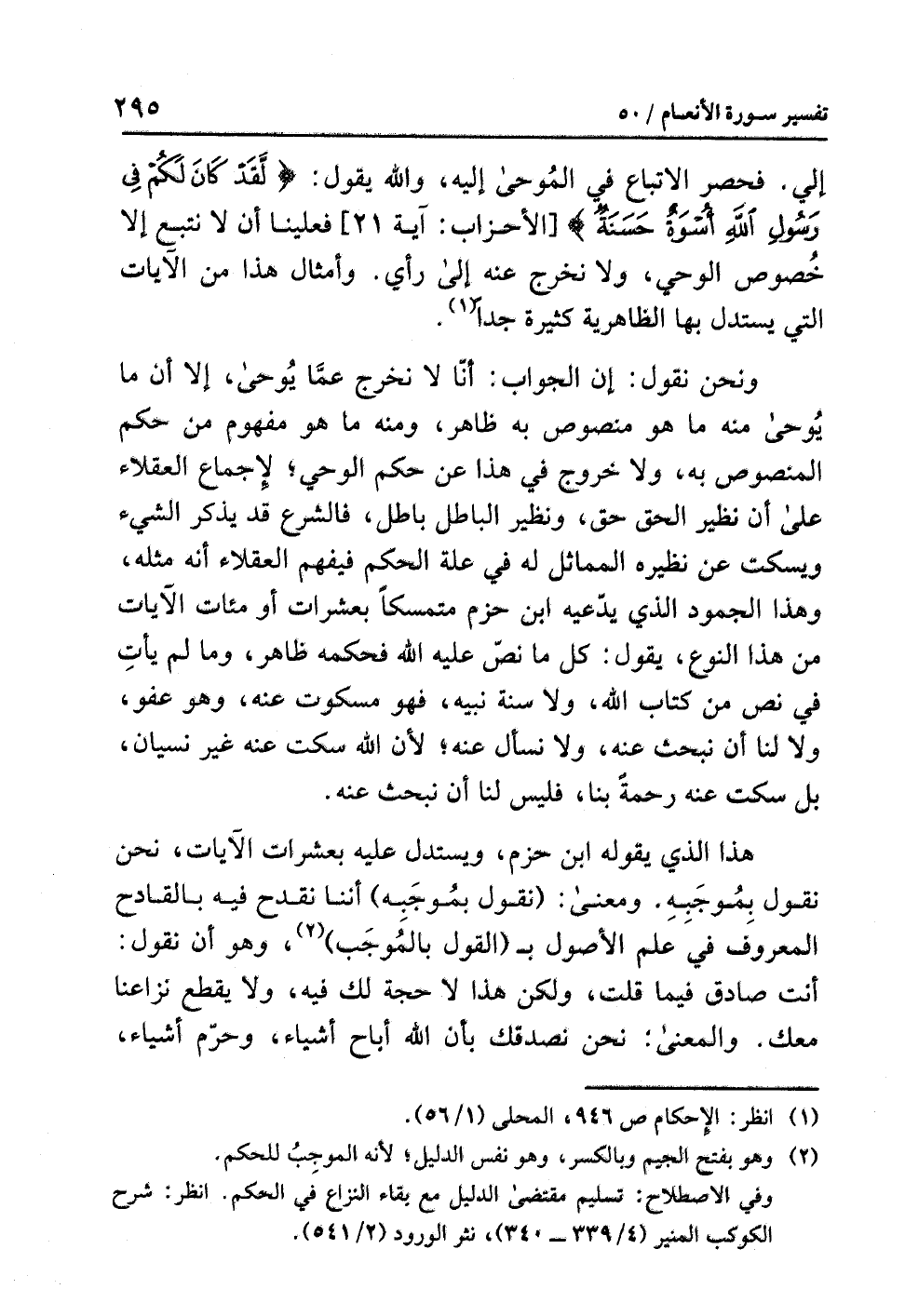 ونحن نقولُ: إن الجوابَ: أَنَّا لا نخرجُ عمَّا يُوحَى، إلا أَنَّ مَا يُوحَى منه ما هو منصوصٌ به ظاهرٌ، ومنه ما هو مفهومٌ من حُكْمِ المنصوصِ به، ولا خروجَ في هذا عن حُكْمِ الوحيِ؛ لإجماعِ العقلاءِ على أن نظيرَ الحقِّ حق، ونظيرُ الباطلِ باطلٌ، فالشرعُ قد يَذْكُرُ الشيءَ ويسكتُ عن نظيرِه المماثلِ له في علةِ الحكمِ فَيَفْهَمُ العقلاءُ أنه مثلُه، وهذا الجمودُ الذي يَدَّعِيهِ ابنُ حزمٍ متمسكًا بعشراتِ أو مئاتِ الآياتِ من هذا النوعِ، يقول: كُلُّ ما نَصَّ عليه اللَّهُ فحكمُه ظاهرٌ، وما لم يَأْتِ في نَصٍّ مِنْ كتابِ اللَّهِ ولا سُنَّةِ نَبِيِّهِ فهو مسكوتٌ عنه وهو عَفْوٌ، ولا لنا أن نبحثَ عنه، ولا نسألَ عنه؛ لأن اللَّهَ سَكَتَ عنه غيرَ نسيانٍ، بل سَكَتَ عنه رحمةً بنا، فليس لنا أن نبحثَ عنه.