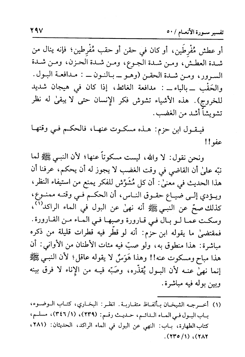 ونحن نقولُ: لاَ وَاللَّهِ، ليست مسكوتًا عنها؛ لأن النبيَّ - صلى الله عليه وسلم - لَمَّا نَبَّهَ على أن القاضيَ في وقتِ الغضبِ لا يجوزُ له أن يحكمَ عَرَفْنَا أن هذا الحديثَ في معنَى: أن كُلَّ مُشَوِّشٍ للفكرِ يَمْنَعُ من استيفاءِ النظرِ، ويؤدي إلى ضياعِ حقوقِ الناسِ أن الحكمَ في وقتِه ممنوعٌ، كذلك صَحَّ عن النبيِّ - صلى الله عليه وسلم - أنه نَهَى عن البولِ في الماءِ الراكدِ (¬1)، وسكتَ عما لو بالَ في قارورةٍ وَصَبَّهَا في الماءِ من القارورةِ. فَمُقْتَضَى ما يقولُه ابنُ حزمٍ: أنه لو قَطَّرَ فيه قطراتٍ قليلةً من ذَكَرِهِ مباشرةً: هذا منطوقٌ به، ولو صَبَّ فيه مئاتِ الأطنانِ من الأَوَانِي: أن هذا مباحٌ ومسكوتٌ عنه!! وهذا هَوَسٌ لا يقولُه عاقلٌ؛ لأن النبيَّ - صلى الله عليه وسلم - إنما نَهَى عنه لأَنَّ البولَ يُقَذِّرُهُ، وصَبُّهُ فيه من الإناءِ لا فرقَ بينَه وبينَ بولِه فيه مباشرةً.