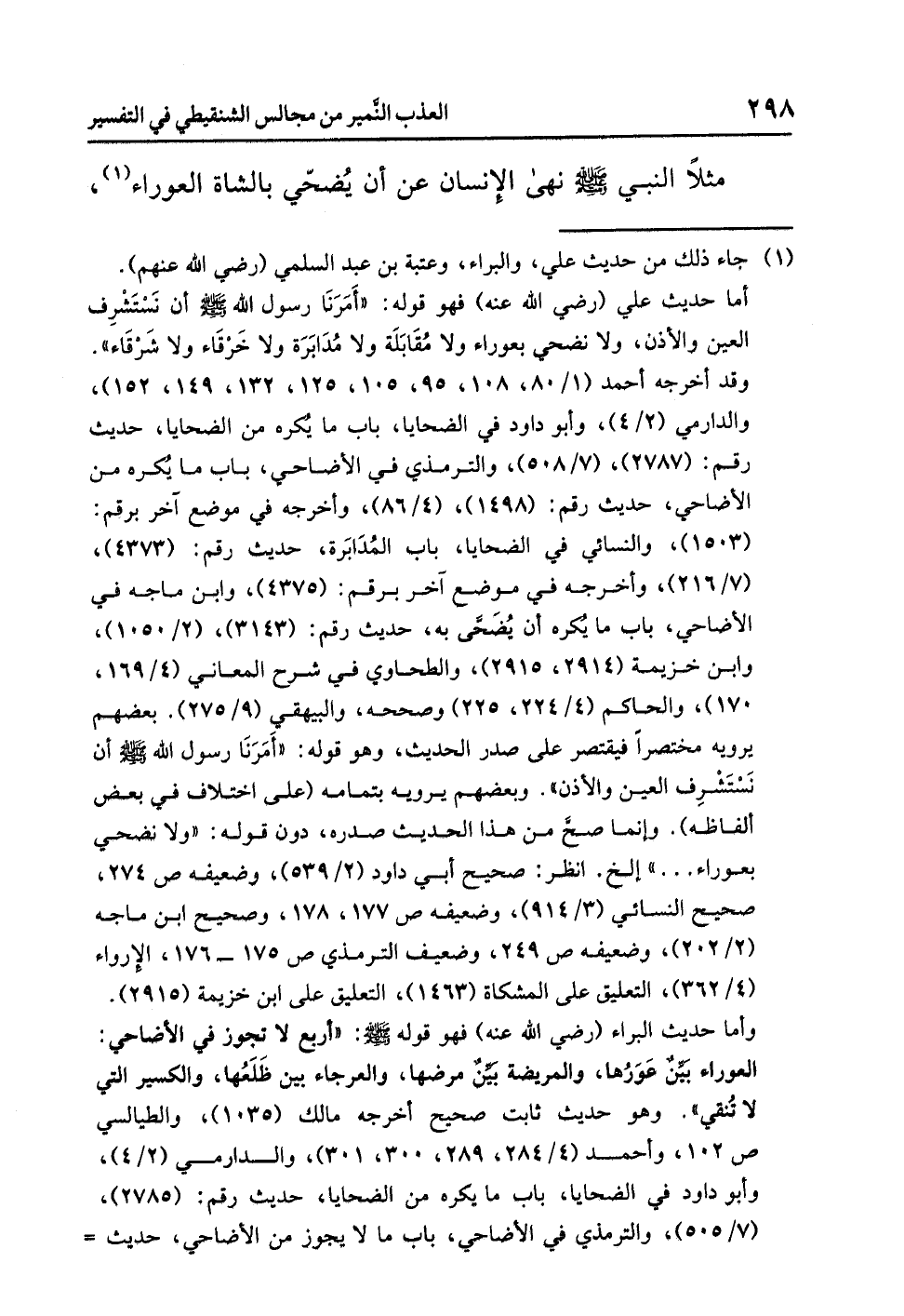 وأما حديث البراء (رضي الله عنه) فهو قوله - صلى الله عليه وسلم -: «أربع لا تجوز في الأضاحي: العوراء بَيِّنٌ عَوَرُها، والمريضة بَيِّنٌ مرضها، والعرجاء بين ظَلَعُها، والكسير التي لا تُنقى». وهو حديث ثابت صحيح أخرجه مالك (1035)، والطيالسي ص 102، وأحمد (4/ 284، 289، 300، 301)، والدارمي (2/ 4)، وأبو داود في الضحايا، باب ما يكره من الضحايا، حديث رقم: (2785)، (7/ 505)، والترمذي في الأضاحي، باب ما لا يجوز من الأضاحي، حديث رقم: (1497)، (4/ 85)، والنسائي في الضحايا، باب ما نُهي عنه من الأضاحي، حديث رقم: (4369)، (7/ 214) وأخرجه في موضعين آخرين برقم: (4370، 4371)، وابن ماجه في الأضاحي، باب ما يُكره أن يُضَحَّى به (2144)، (2/ 1050)، وابن خزيمة (2912)، والطحاوي في شرح المعاني (4/ 168، 169)، وابن حبان (الإحسان): (5889، 5891 - 5892)، والحاكم (1/ 467) وصححه، والبيهقي (5/ 242)، (9/ 274) وابن الجارود (481، 907). وانظر: صحيح أبي داود (2/ 539)، صحيح الترمذي (2/ 88)، صحيح النسائي (3/ 913، 914)، صحيح ابن ماجه (2/ 202)، الإرواء (4/ 360 - 361). وأما حديث عُتْبَة بن عَبْد السلمي (رضي الله عنه) وفيه: «إنما نهى رسول الله - صلى الله عليه وسلم - عن المُصْفَرَّة والمُسْتَأْصَلَة، والبَخْقَاء، والمُشَيِّعَة، والكَسْرَاء». والبَخْقَاء: هي التي تبخق عينها، أي يذهب بصرها. وقد أخرجه أبو داود في الضحايا، باب ما يُكره من الضحايا، حديث رقم: (2786)، (7/ 506)، والحاكم (4/ 225) وصححه، والبيهقي (9/ 275). وهو ضعيف الإسناد. وانظر: ضعيف أبي داود ص 274.