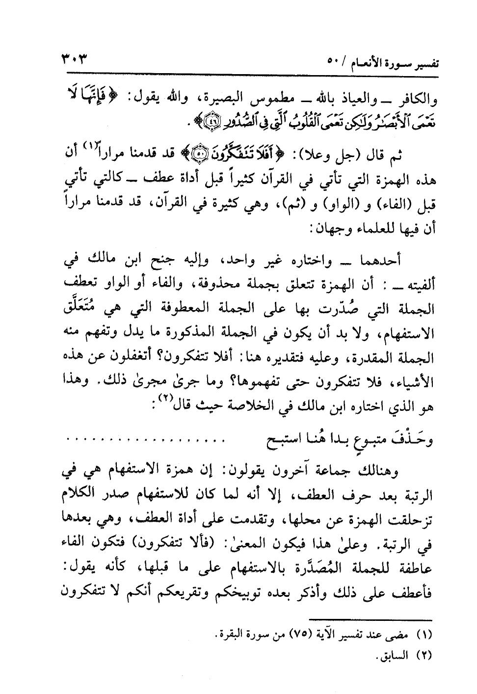 أحدُهما - واختارَه غيرُ واحدٍ، وإليه جَنَحَ ابنُ مَالِكٍ في ألفيتِه -: أن الهمزةَ تتعلقُ بجملةٍ محذوفةٍ، والفاءَ أو الواوَ تعطفُ الجملةَ التي صُدِّرَتْ بها على الجملةِ المعطوفةِ التي هي مُتَعَلَّقُ الاستفهامِ، ولا بد أن يكونَ في الجملةِ المذكورةِ ما يدلُّ وَتُفْهَمُ منه الجملةُ المقدرةُ، وعليه فتقديرُه هنا: أفلاَ تتفكرونَ؟ أتغفلونَ عن هذه الأشياءِ، فلا تتفكرونَ حتى تَفْهَمُوهَا؟ وما جَرَى مَجْرَى ذلك. وهذا هو الذي اختارَه ابنُ مالكٍ في الخلاصةِ حيث قال (¬2):
